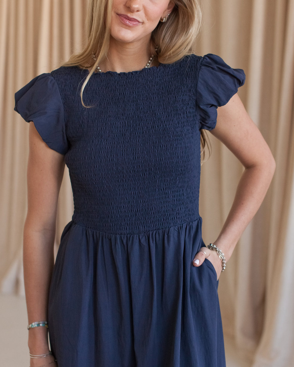 A navy midi dress with smocked bodice, high crew neckline, short puff sleeves, flowy skirt, and pockets. Pair with an oversized sweater and boots for colder weather, and with sandals and a basket tote for warmer months.
