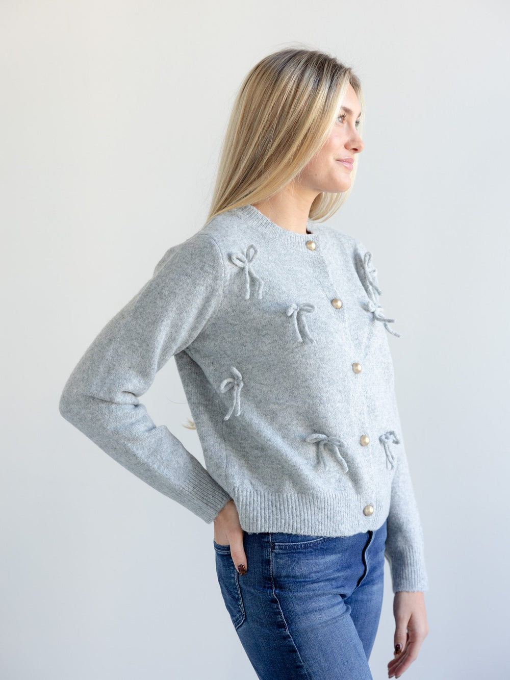 This button down sweater is a soft and thick knit, with stripe detailed hem, and a fitted waist. The sewn-on grey bows throughout the front make this a great addition to your fall wardrobe with simple gold buttons to elevate any outfit.