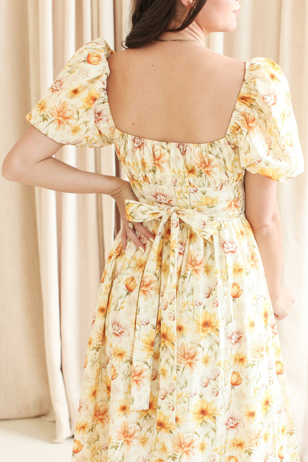 This beautiful floral print dress features a smocked bodice with zipper, a fitted self-tie waist, puff sleeves and a square neckline. Pair with your favorite heels.