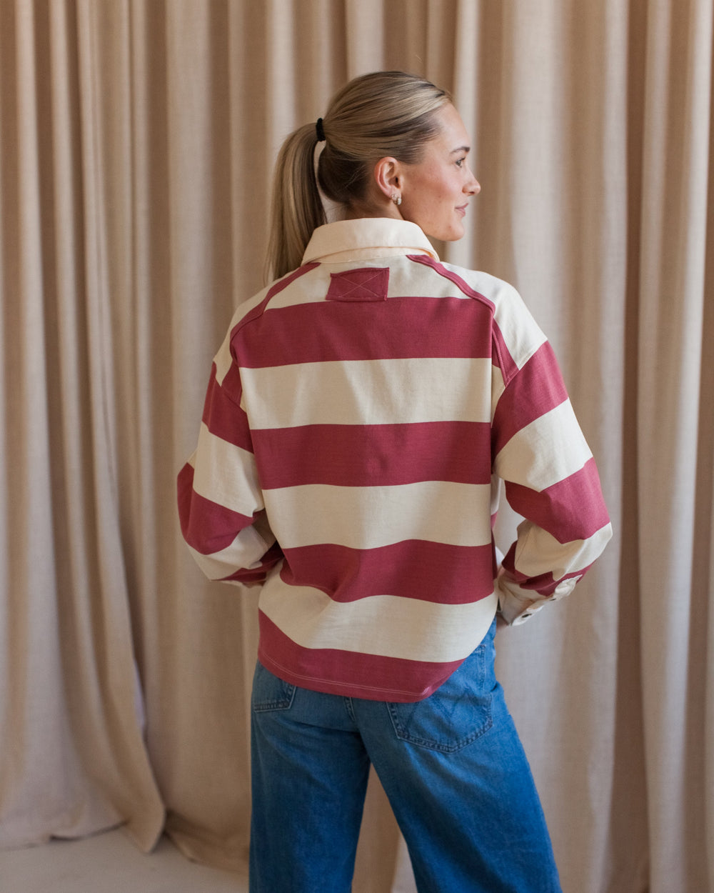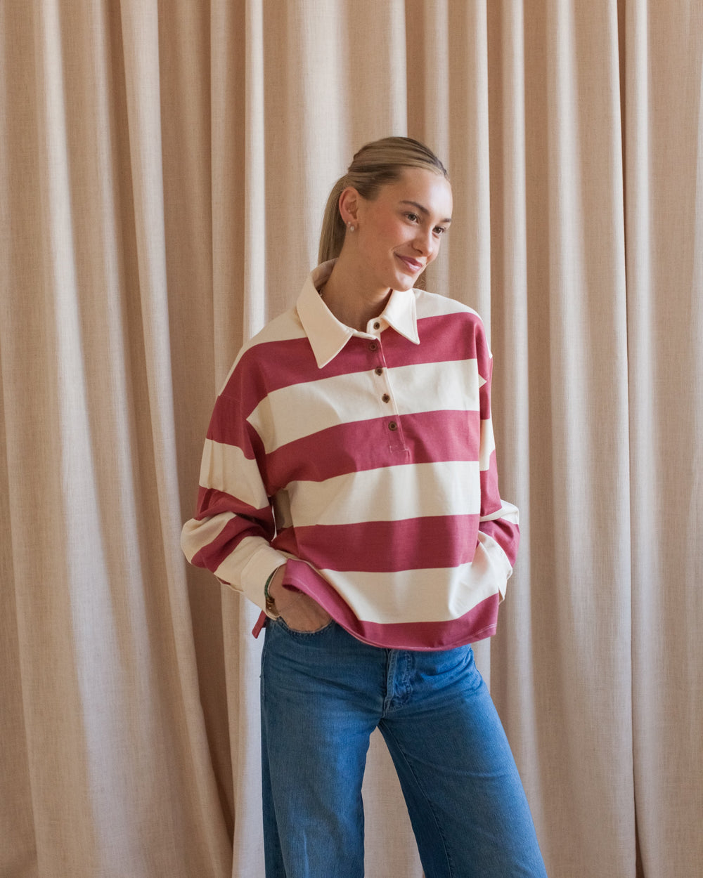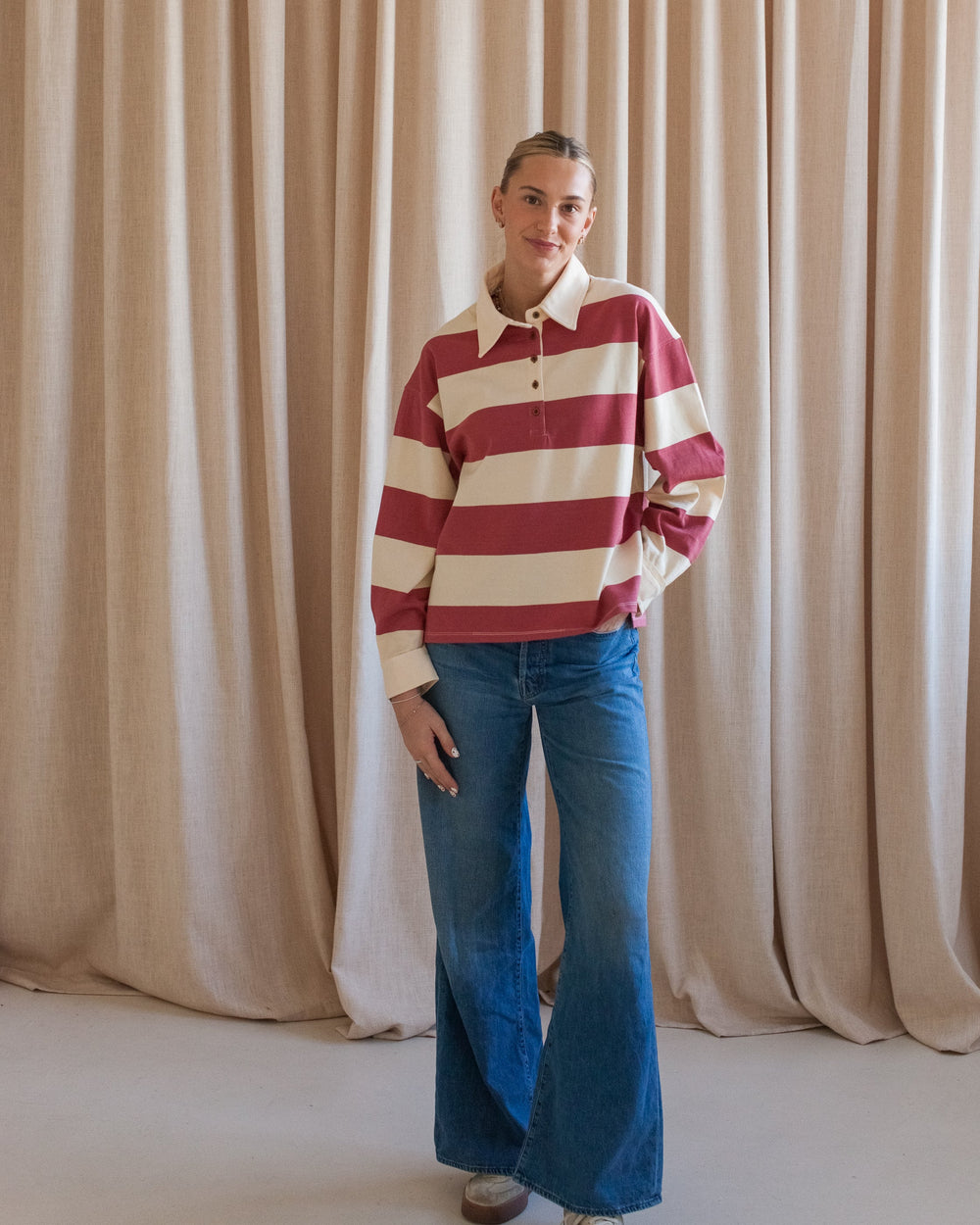 This 100% cotton long sleeve polo features a relaxed fit, timeless red and cream stripes, and a button down collar. It's the perfect easy layer for any season.