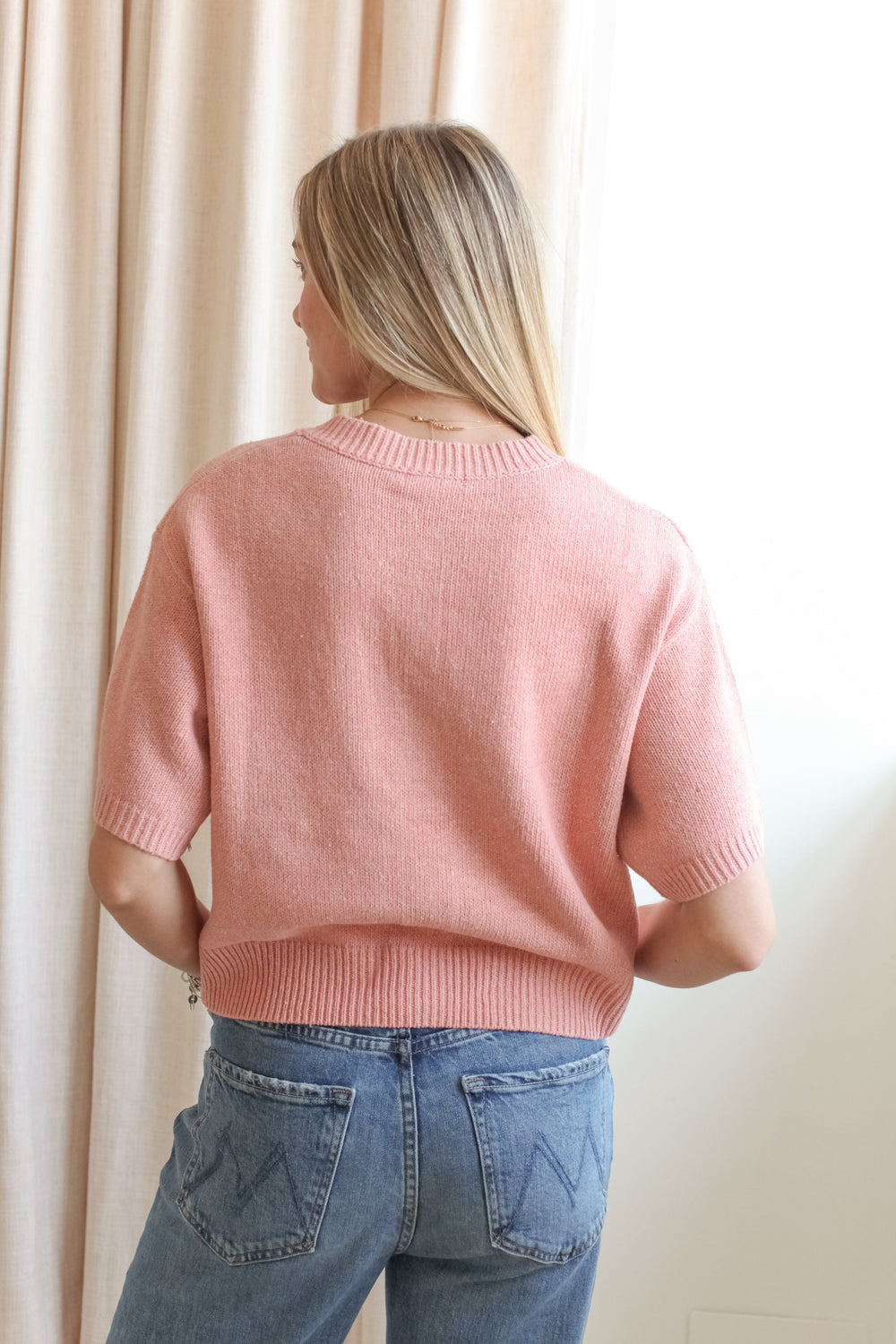 This knit short sleeve button front cardigan is a wardrobe staple piece that can be worn through multiple seasons. Features ribbed detailing along cuffs, neckline, and buttons. Pair over a white tank with jeans and sandals.