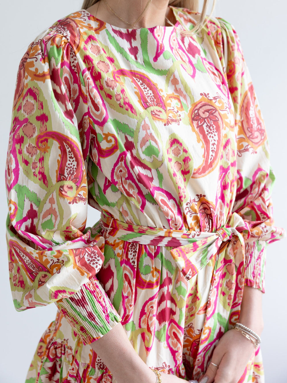 This dress is an eye-catching spring transition piece. It features a bright paisley print, round neckline, and a full skirt with ruffled hemline. The long sleeves have smocked cuffs to accentuate a fuller look, and it has an elasticized waist with a tie belt.