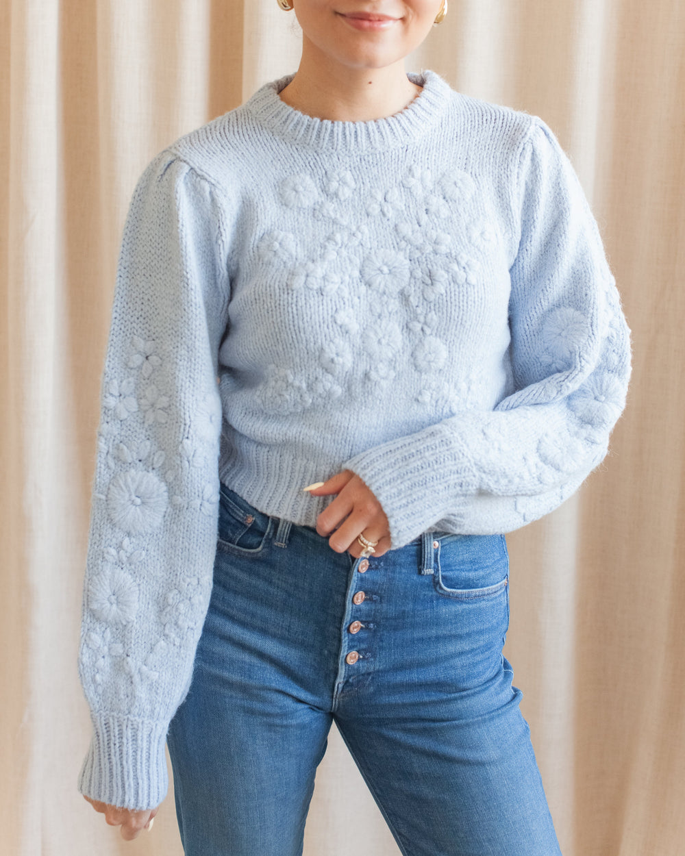 A knit sweater featuring floral embroidery, long puff sleeves and ribbed detailing along the cuffs and hem. Pair with denim and sneakers for a perfect day outfit.