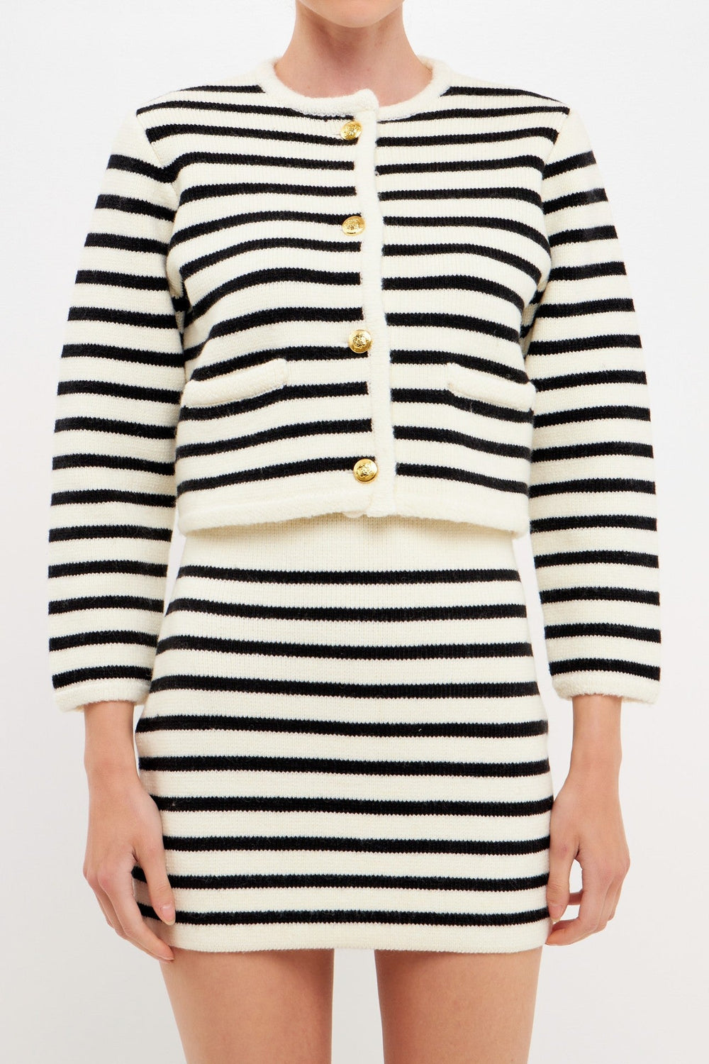 Your search for the perfect striped cardigan is over. Channel your inner French girl in this classic black + white cardigan dawned with gold buttons. A classic piece you'll have for years to come.