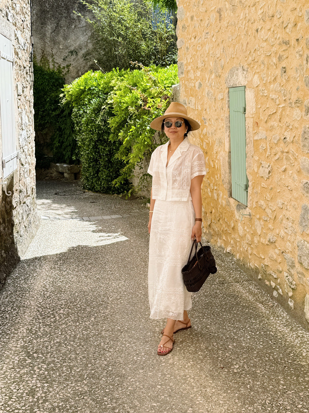This straight style midi skirt features a delicate floral eyelet pattern with a small slit in back for movement and added comfort. Pair with the matching Carina Eyelet blouse and flat sandals