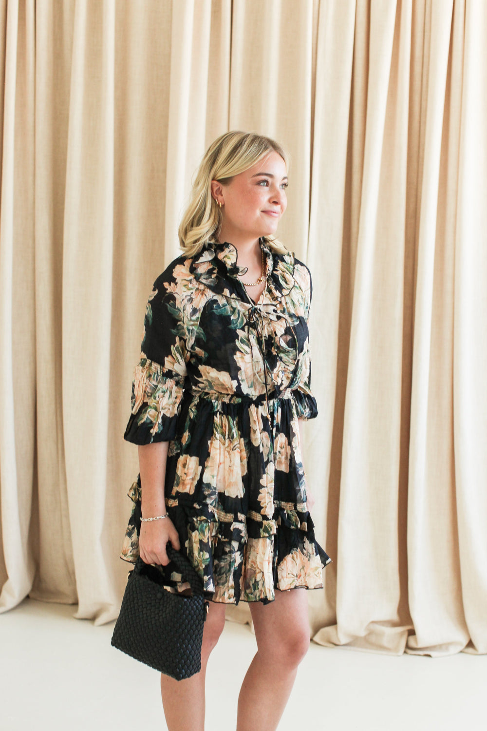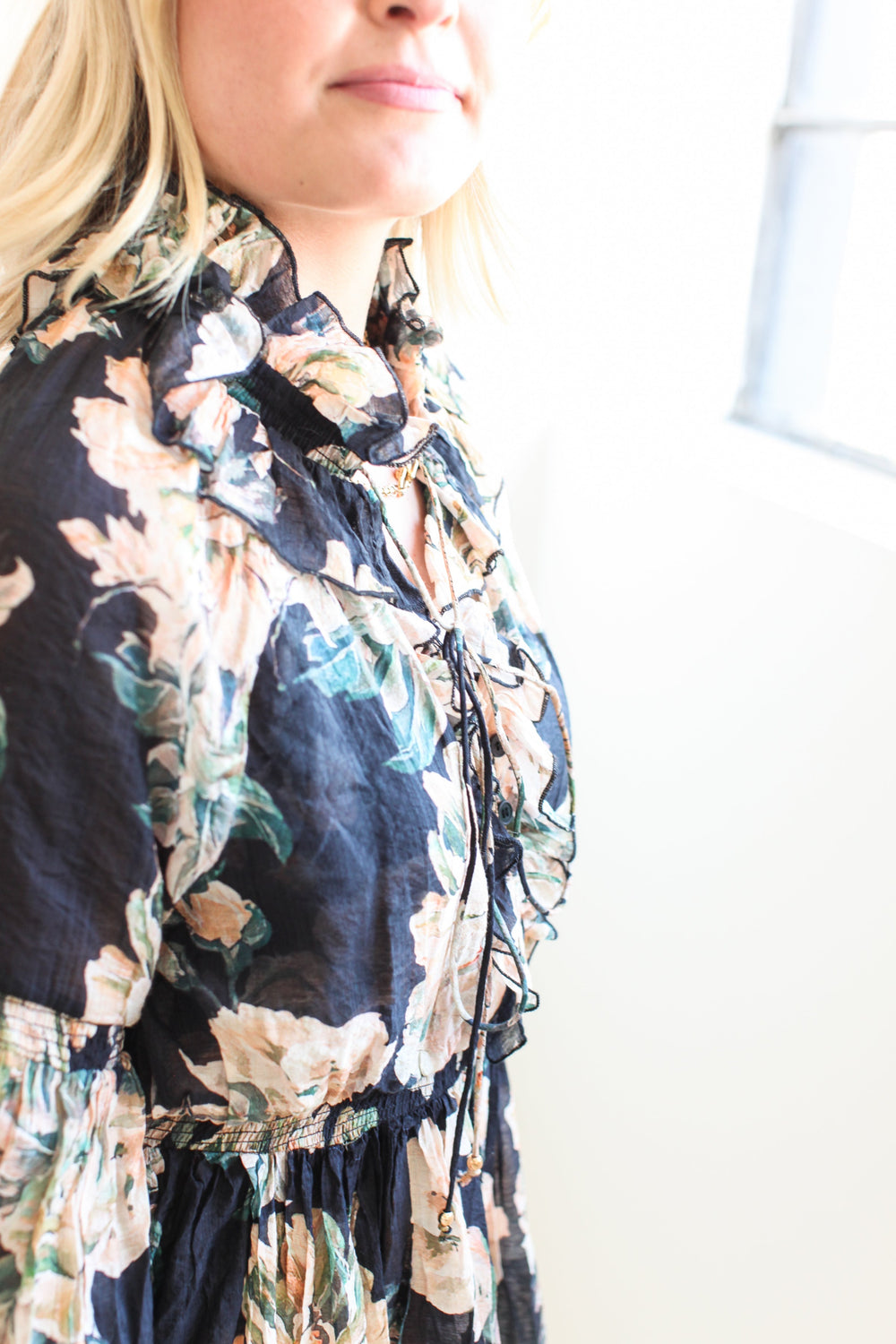 This floral print sheer mini dress with long sleeves features a ruffled collar and neckline as well as subtle ruffled tier details. With a smocked waist and elasticized cuffs, this dress is comfortable and easy to wear while being slightly dressy. Dress is fully lined with a printed slip and has a tie detail at the neckline.