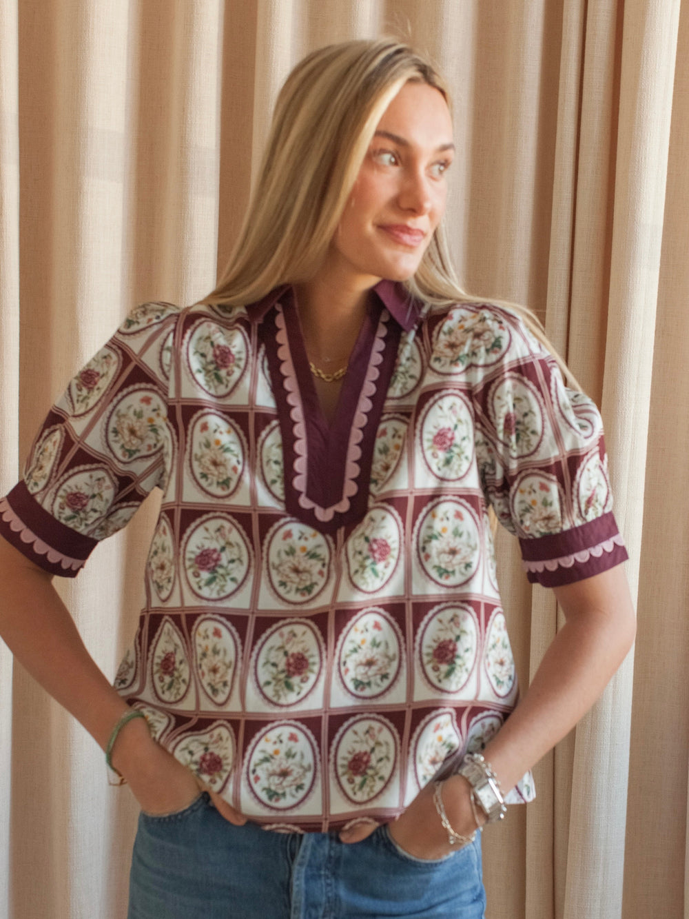 A charming vintage-inspired blouse featuring an intricate floral medallion print in burgundy and soft cream tones. Designed with a structured collar, scalloped trim, and contrast detailing along the neckline and sleeves. Pair with dark denim and boots this season.