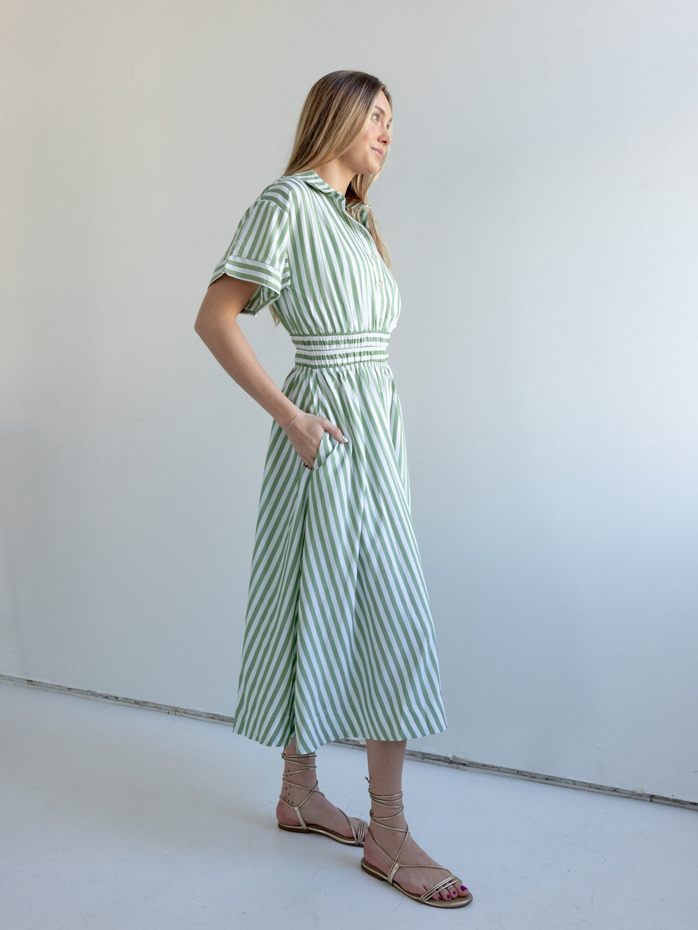 The Charlie Stripe Dress features a shirt collar, button down front, cuffed sleeves and an elasticized waist to ensure a perfect fit. This full skirt dress also has pockets. Pair with heels for a fancy look.