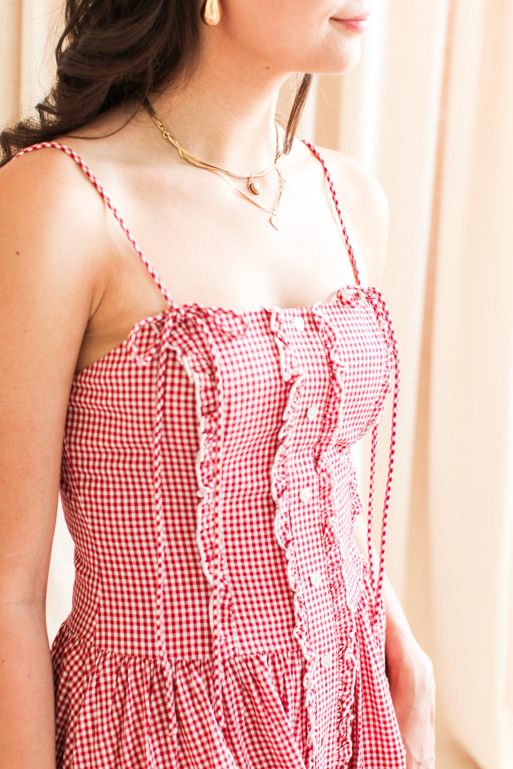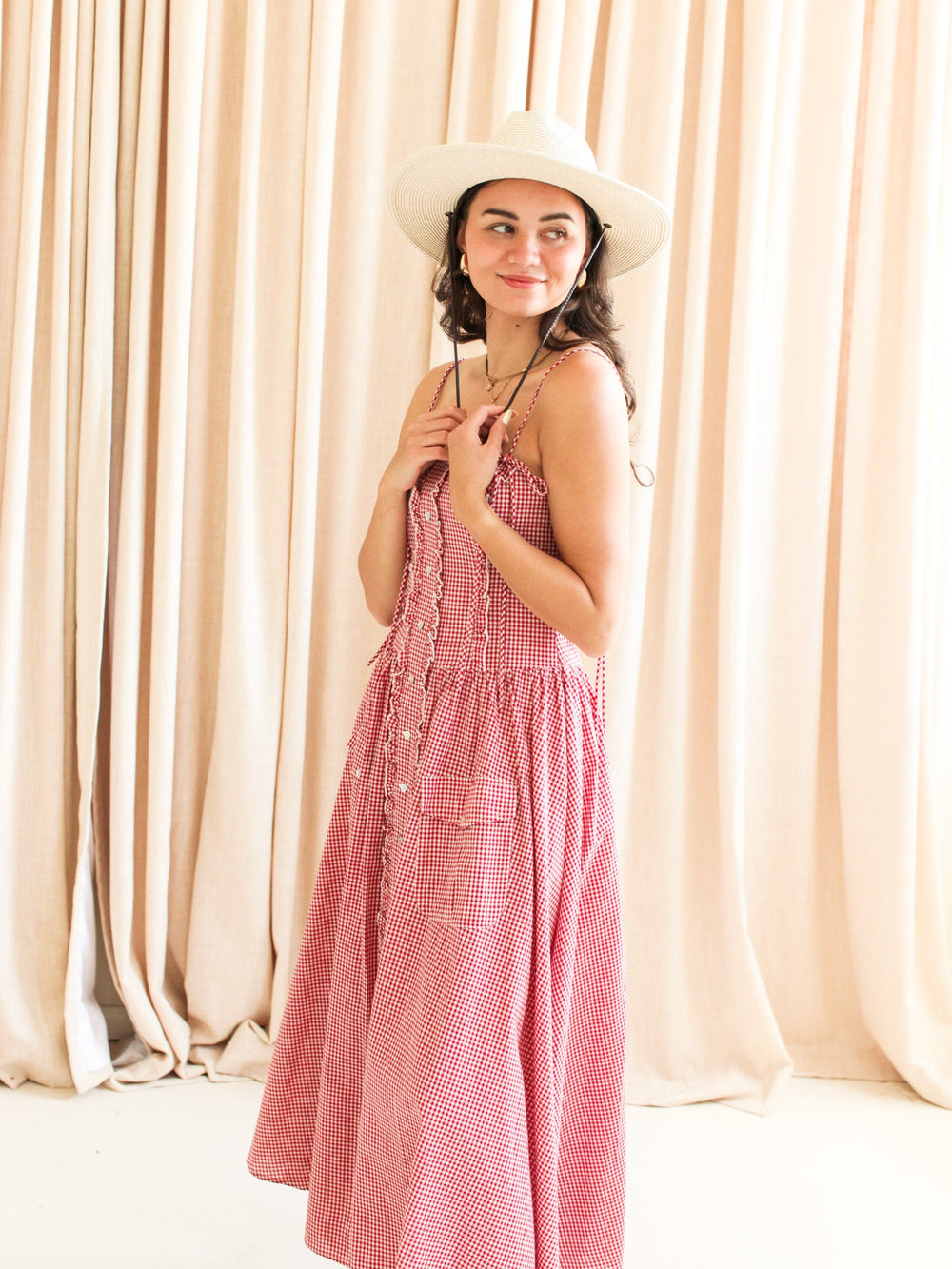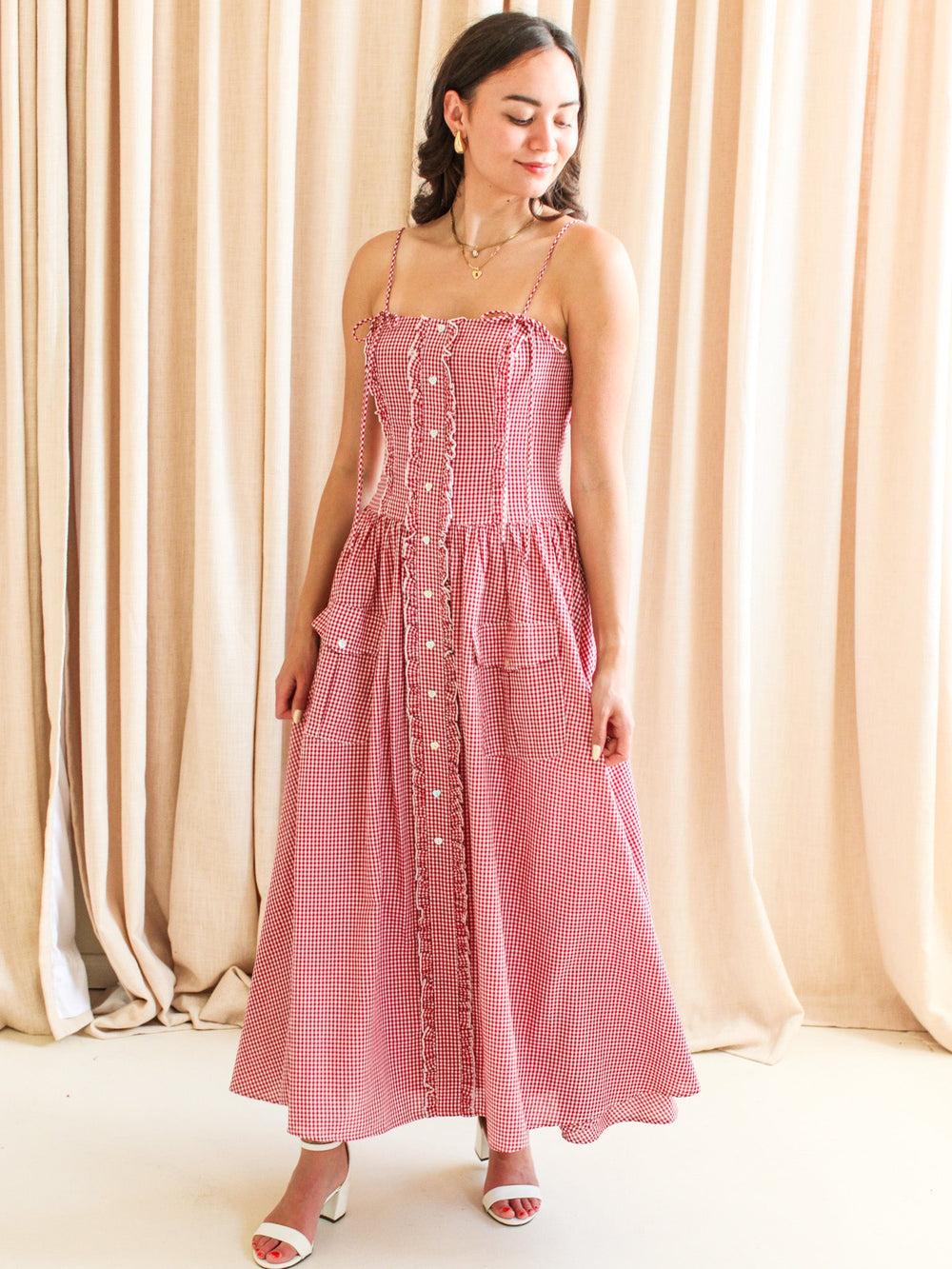 A gingham midi dress with full skirt and thin adjustable straps with bows.. Features a ruffled placket with heart buttons and front patch pockets. Back zip closure with smocking for added comfort.
