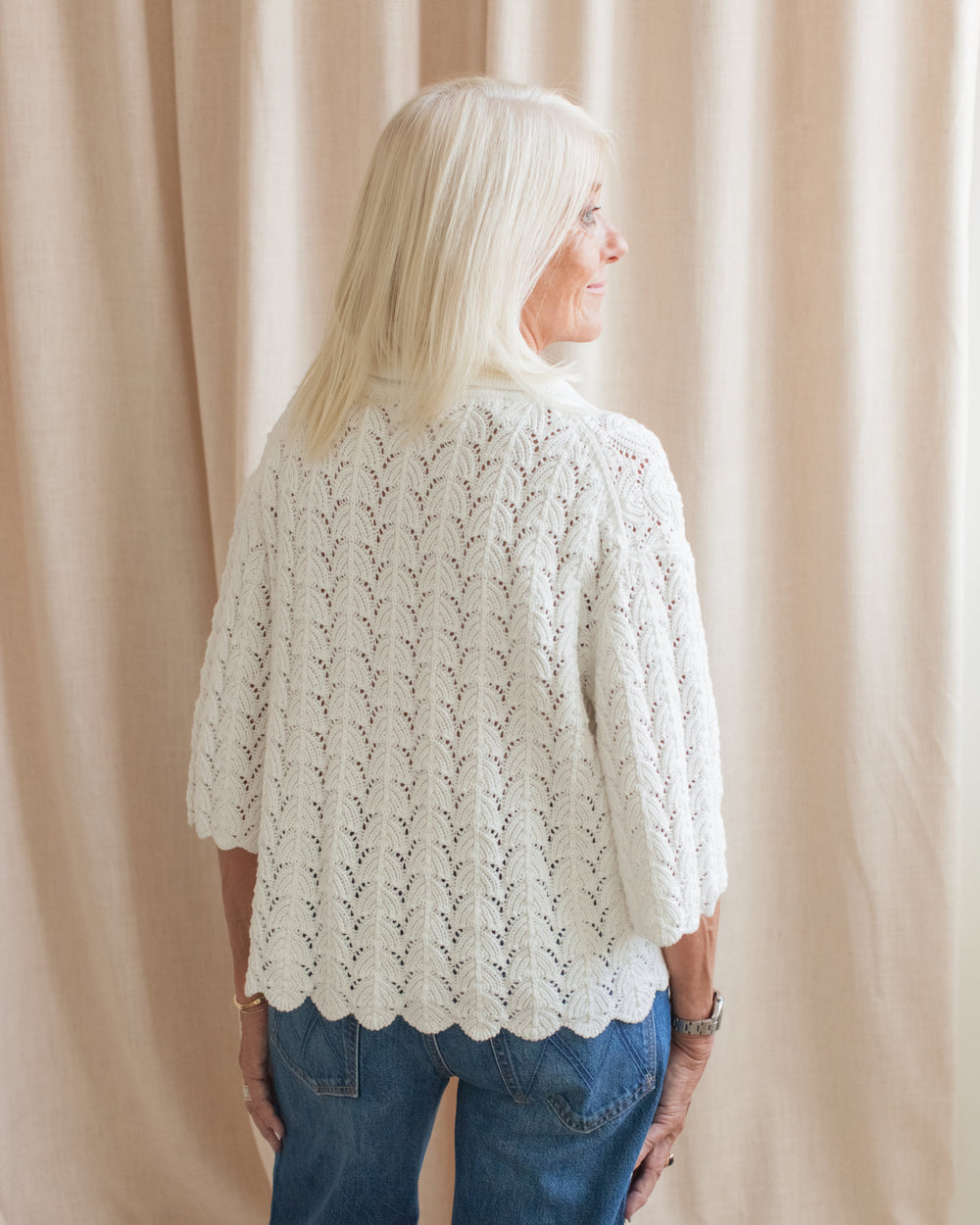 This half-sleeve cardigan is constructed from a patterned crochet knit cotton with front buttons. Features a collar, slight cropped boxy fit, and scallop trim. Pair with denim or trousers for an easy, polished look.