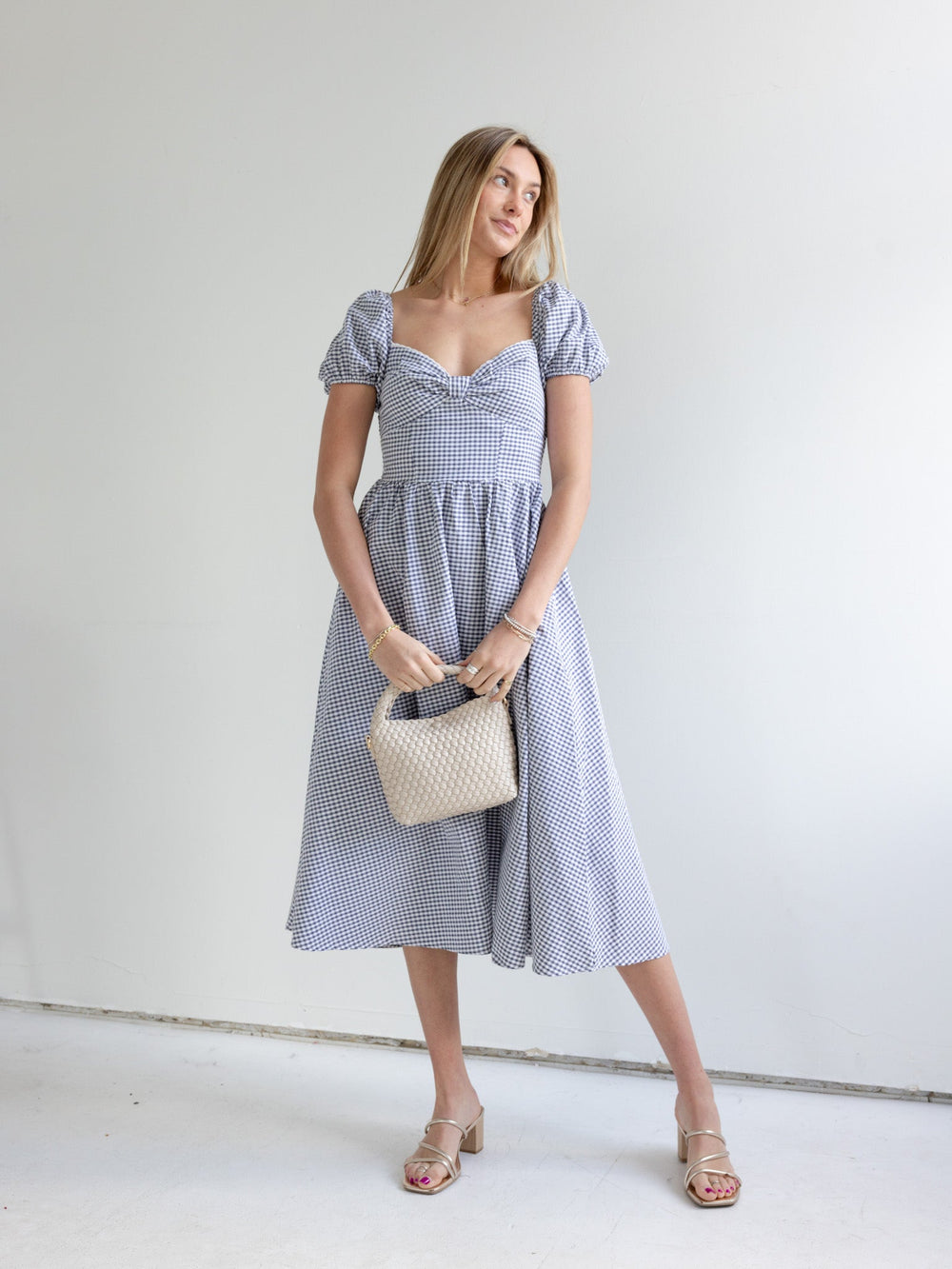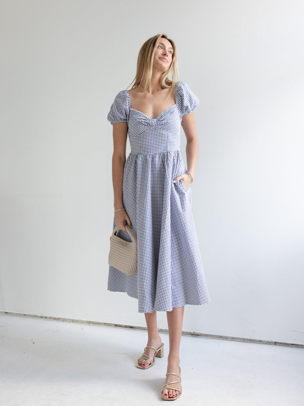 A true spring staple, this midi dress features a puff sleeve and sweetheart neckline with lace trim and subtle bow detail. Dress is unlined but not sheer, has pockets and a smocked back for ease and comfortability.
