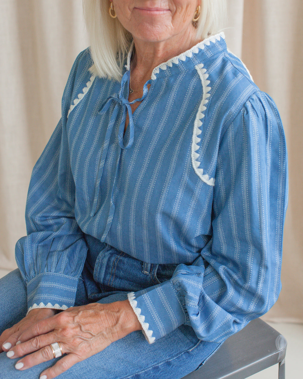 A high neck blouse featuring embroidered detailing, tie closure on the neckline, and buttoned cuffs. Pairs perfectly with your favorite denim and sneakers for a casual look.