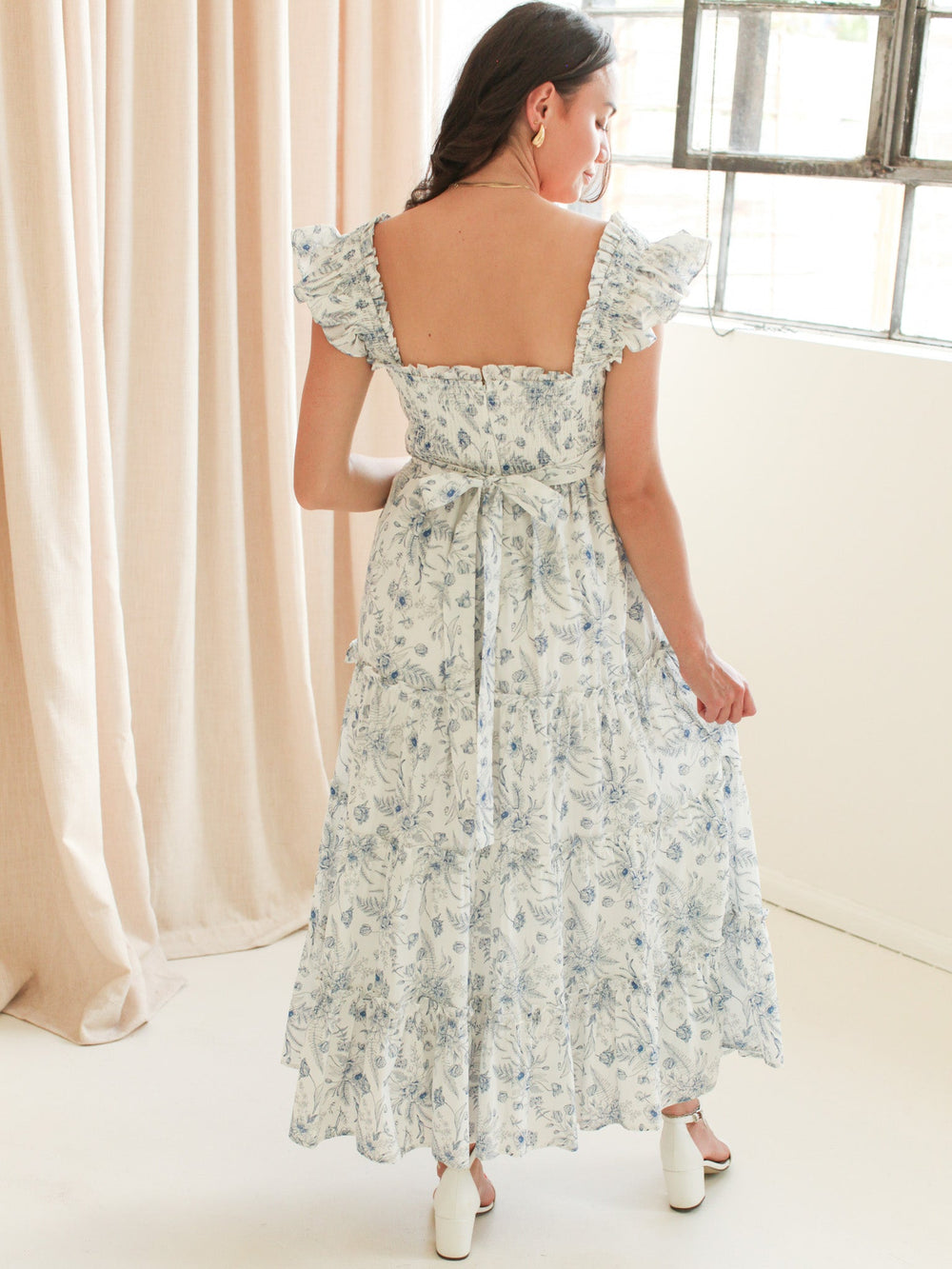 A flutter sleeve tiered floral midi dress with fitted smocked bodice, full skirt, and tie around the back. Dress features pockets, full lining, and back zip closure.