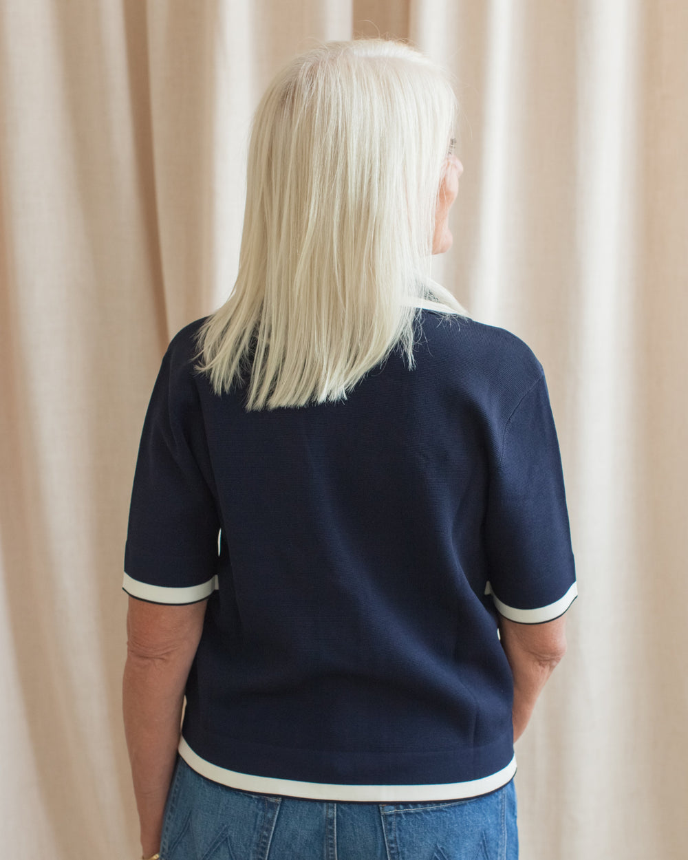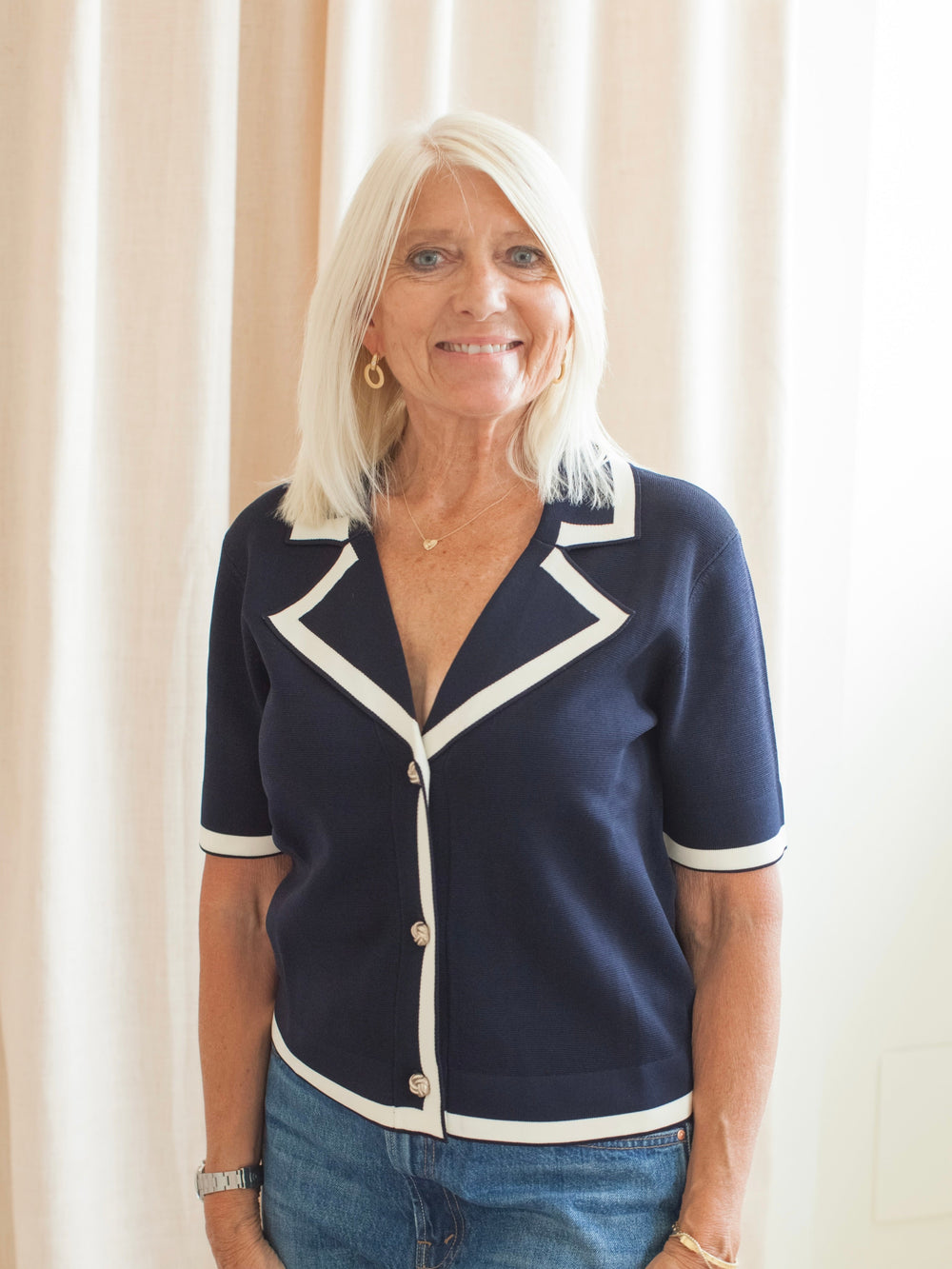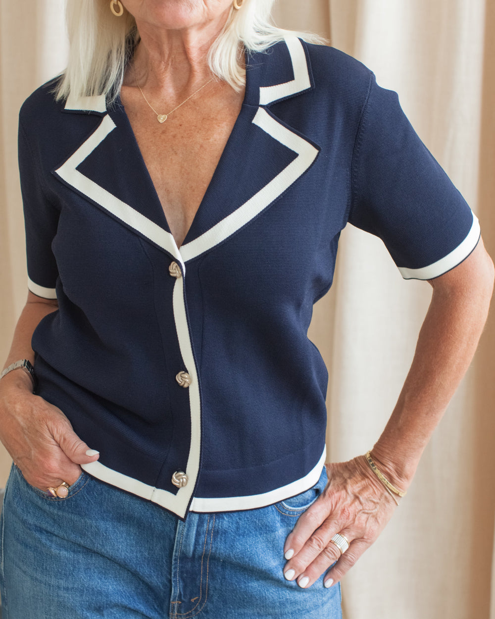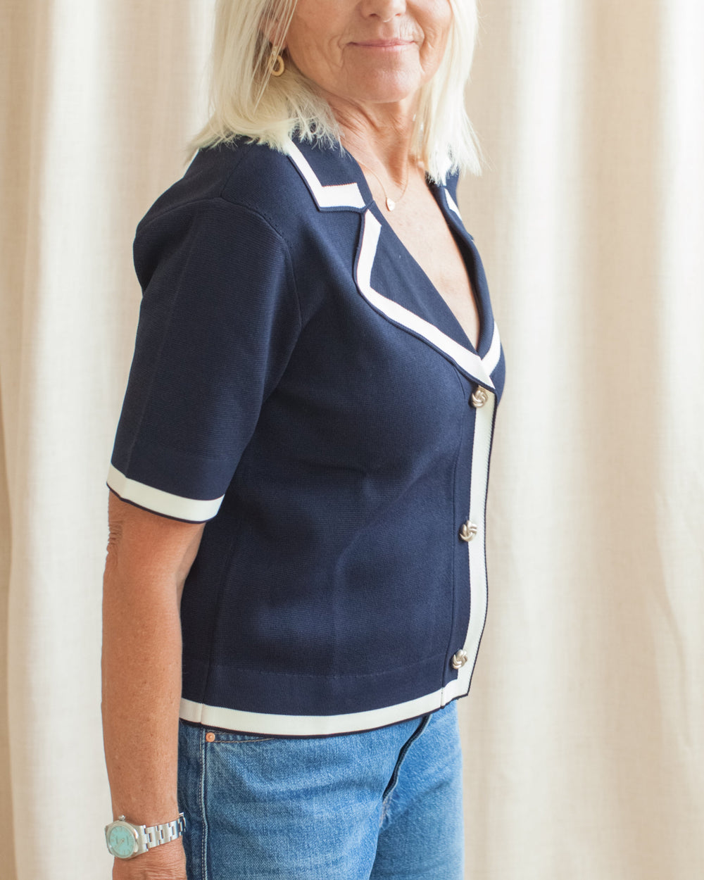 A medium weight knit featuring contrast detailing, V neckline and silver buttons. Pair with trousers for an elevated look.
