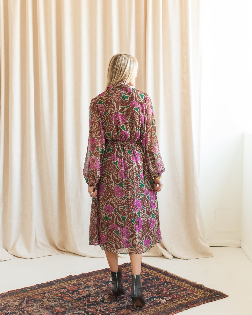 A midi dress featuring front bow tie closure, balloon sleeves with elasticated cuffs, and smocked back waist band for additional comfort. Pair with your favorite suede boots and a clutch.