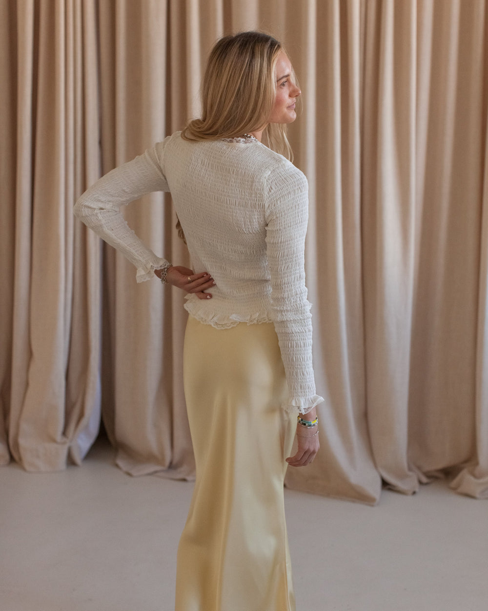 A smocked long sleeve button front blouse with lace trim throughout, and subtle ruffle detailing at waist and cuffs. Pair with dark wash jeans and flats to transition into spring.
