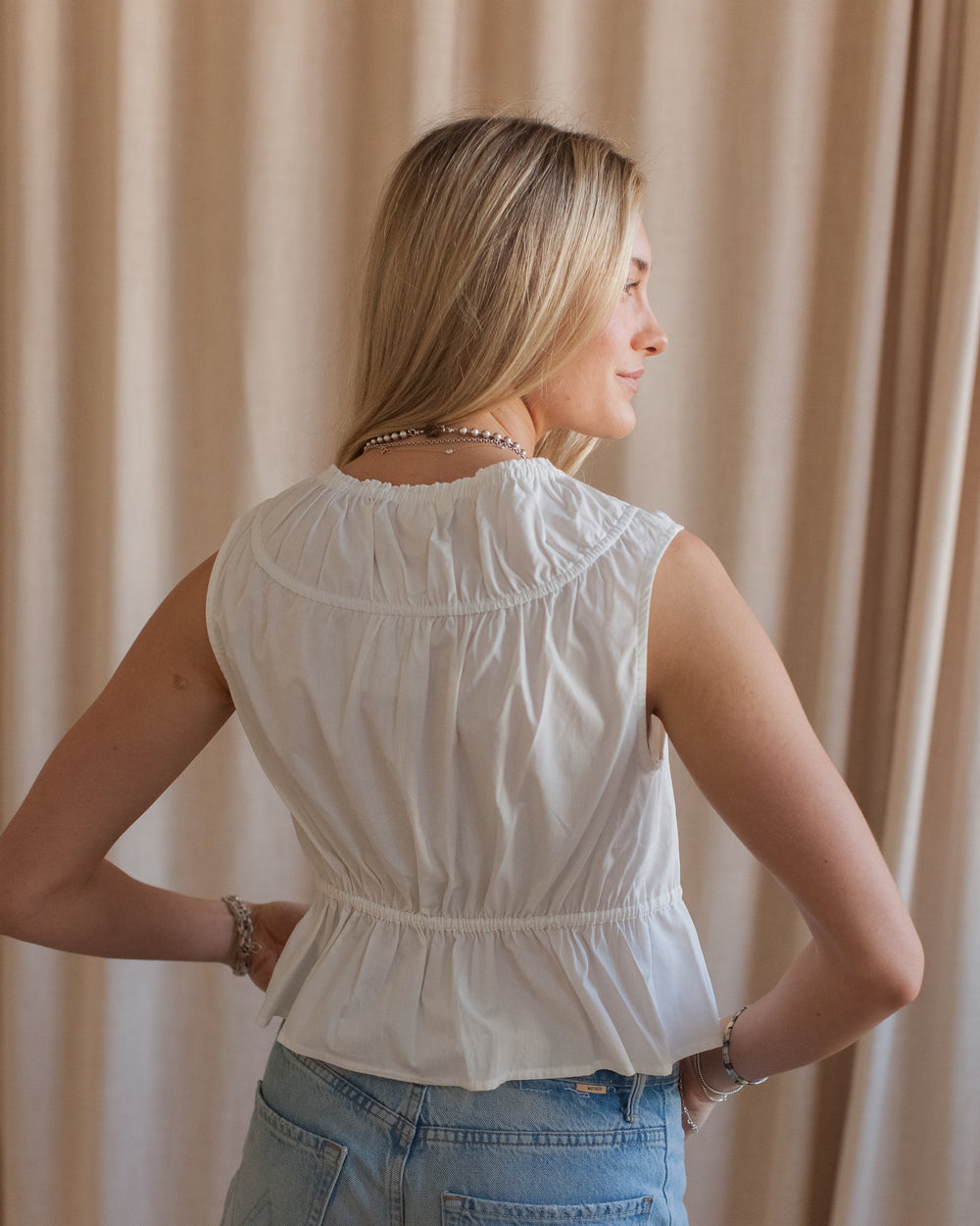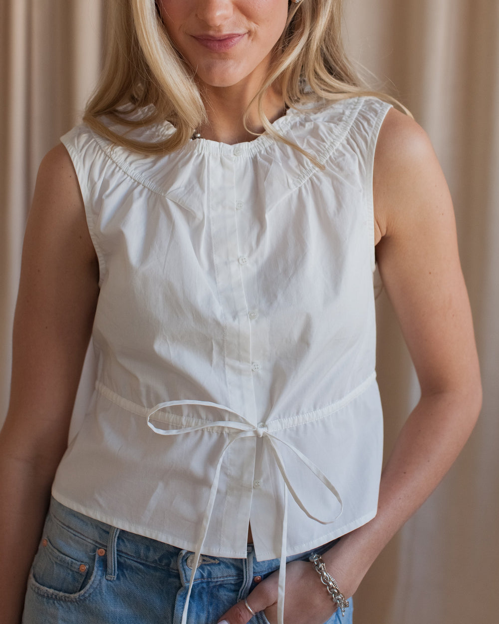 This sleeveless cotton blouse features a button front, shirred detailing at neck, and tie at the waistline. Pair with dark denim and red flats.