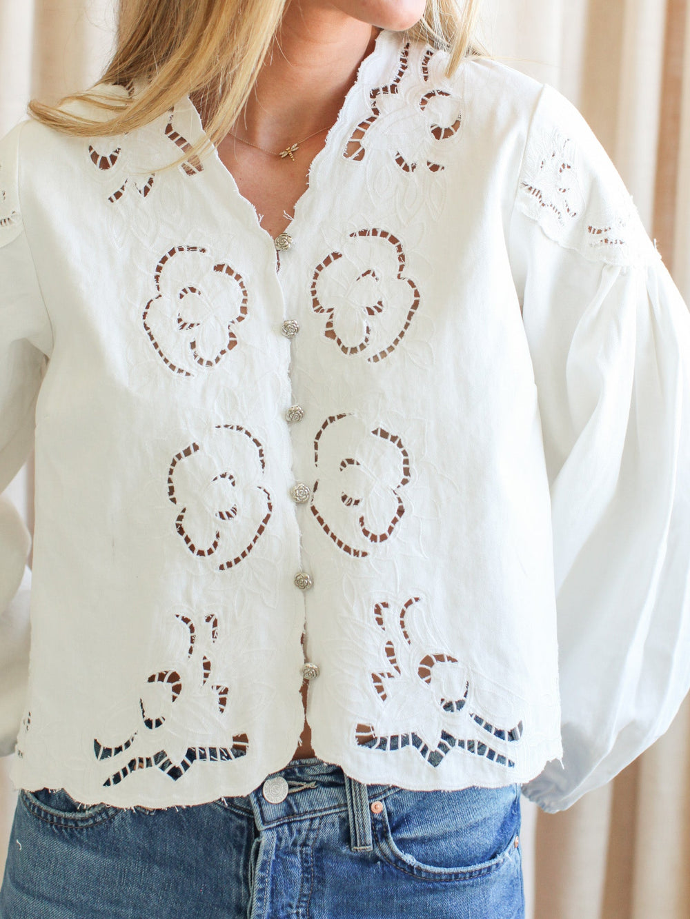 This slightly cropped denim balloon sleeve blouse featuring floral embroidery and eyelet cutouts is the perfect companion to your favorite pair of jeans. The lightweight denim fabric gives it a structured look with a subtle A-line silhouette, and rosette buttons up front.