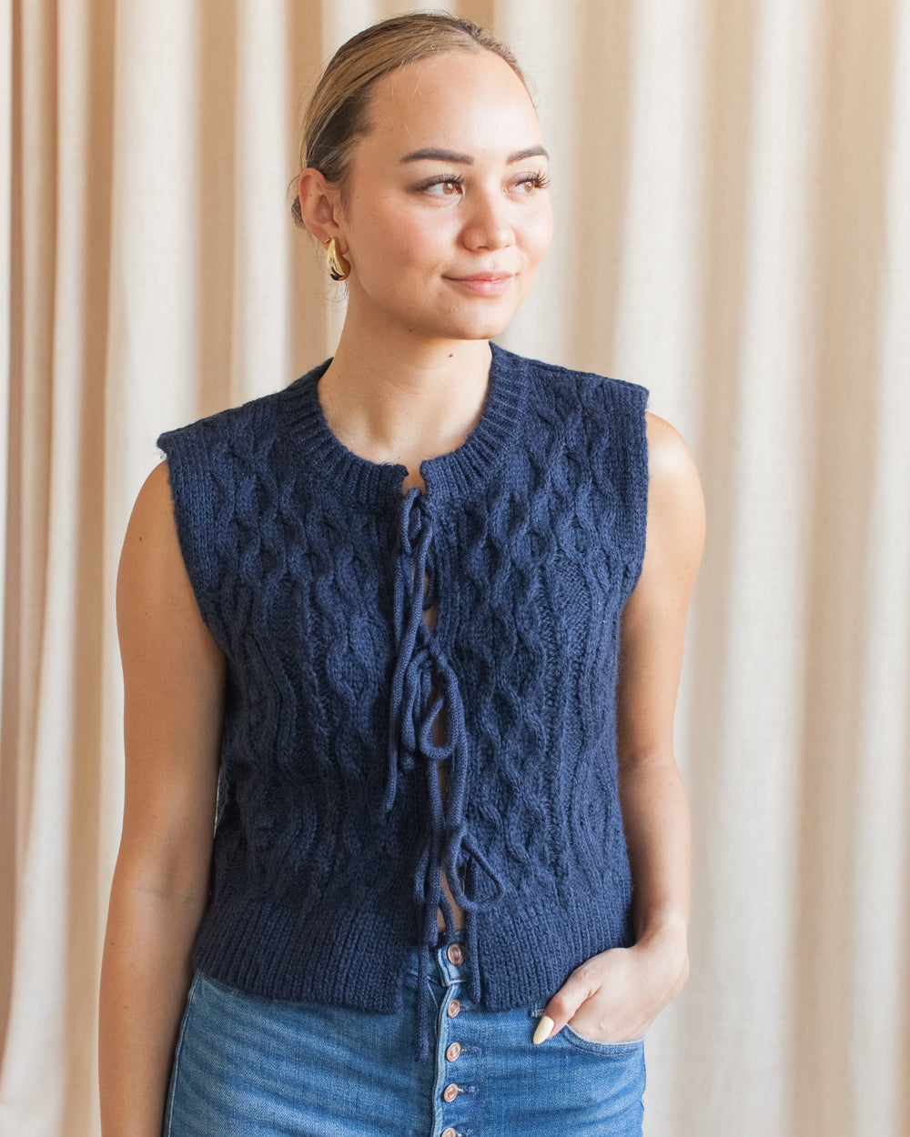 A cable knit vest featuring 3 ties in the front. Pairs perfectly over a long sleeve shirt and denim this fall.