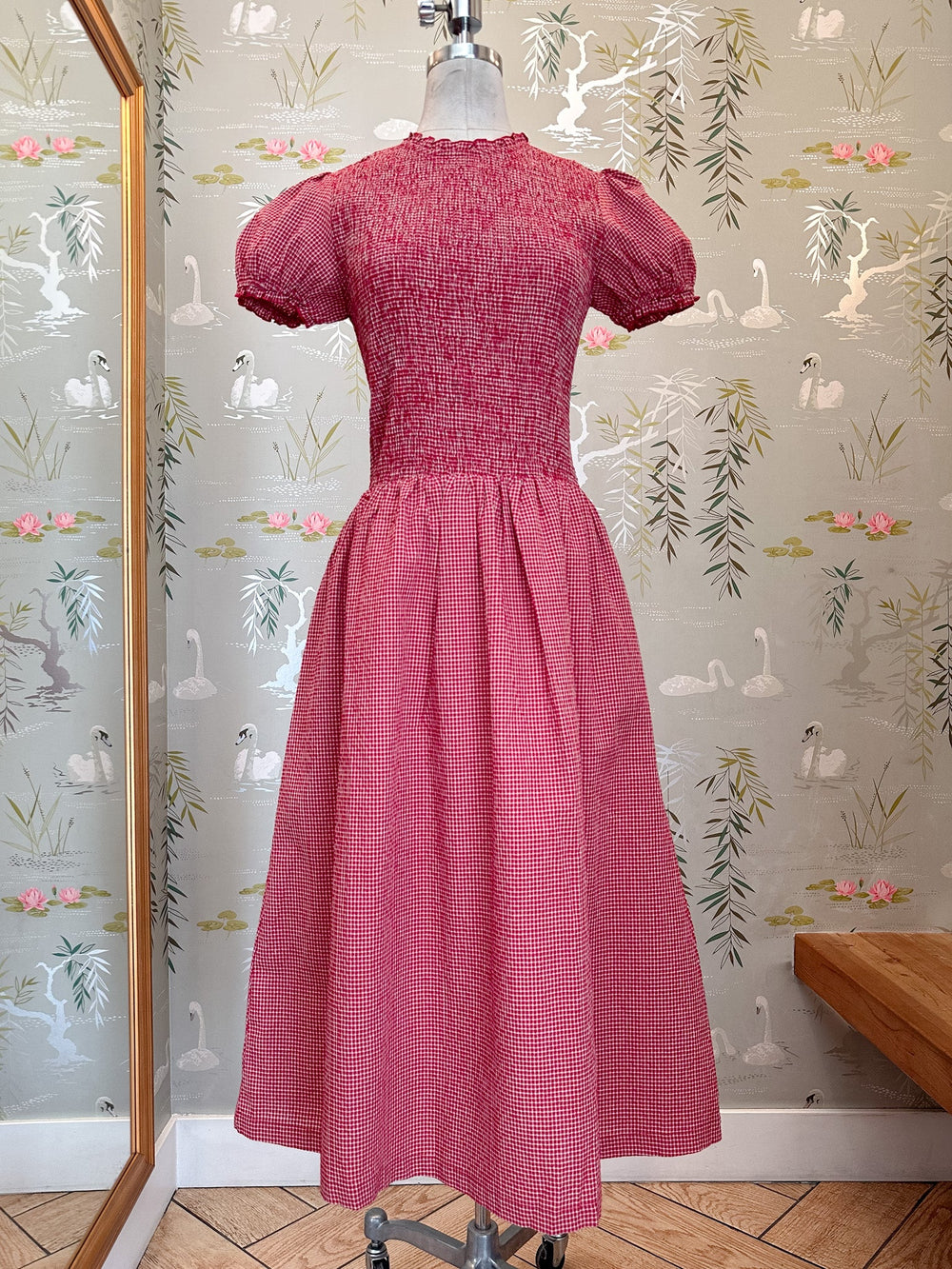 A gingham midi dress with a smocked, form-fitting bodice and a flowing skirt that creates a flattering shape. Designed with short puff sleeves, and a ruffle-edged crew neckline. Pair with sneakers for the day or heels for a night out.