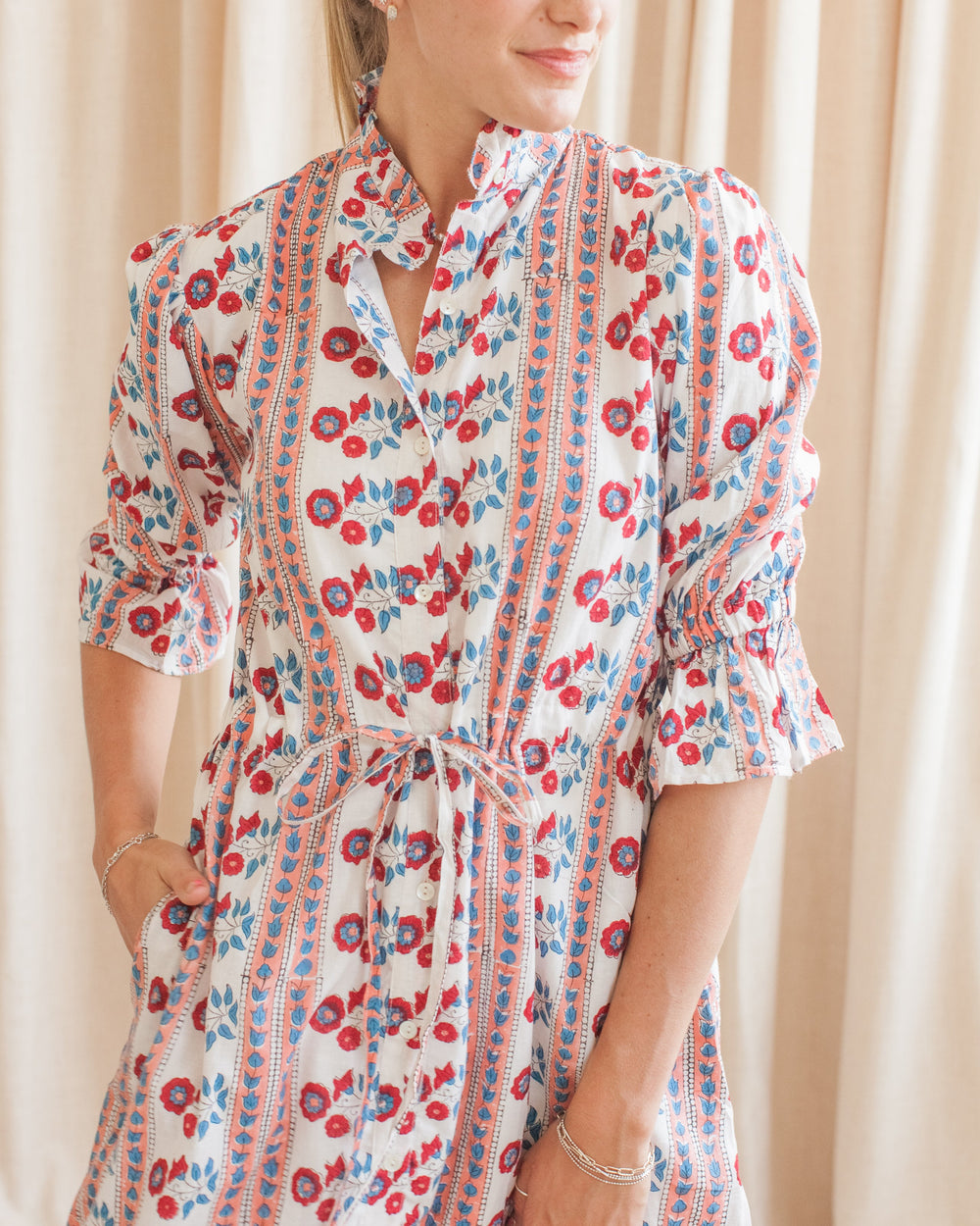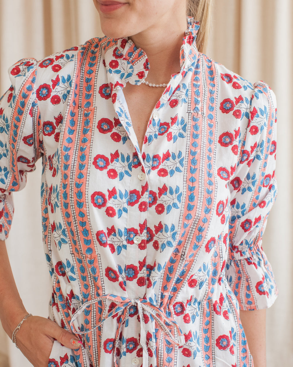 Made by us, for you. A feminine shirt dress with a ruffle Victorian collar, 3/4 sleeve, button front, fully lined, and pockets, complete with a drawstring waist. Made by the same female owned workshop that creates our table top collection, each dress is crafted by hand made with hand block printed fabrics.