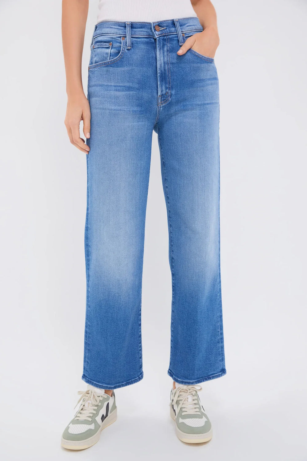 Take a hint. High-waisted jeans with a wide straight leg, zip fly and clean 29.25-inch inseam. Crafted from soft stretch denim, Read Between The Lines is a medium blue wash with subtle fading and whiskering.