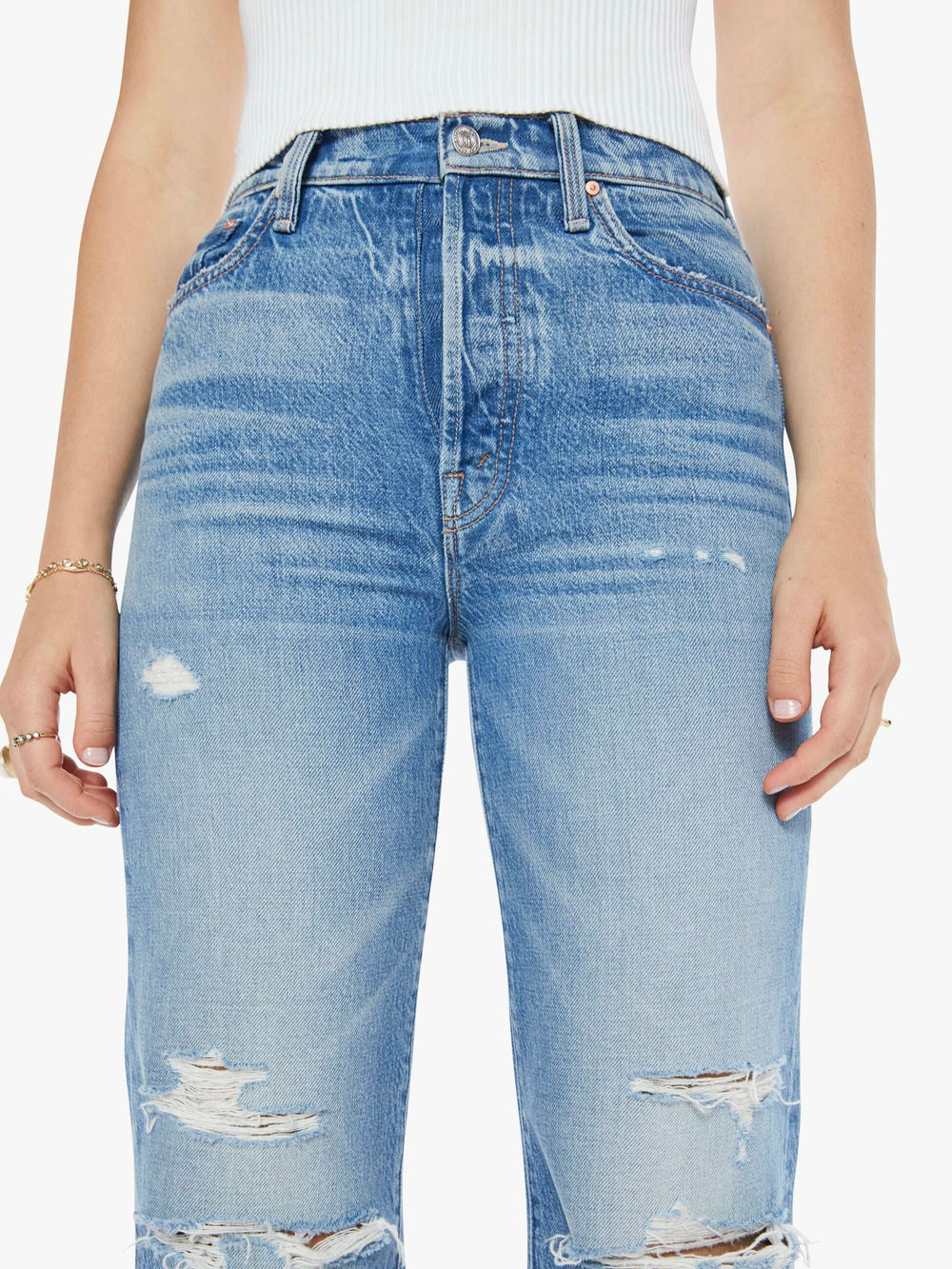 Taking care of business. High-waisted pants with a wide straight leg, button fly, and long 32-inch inseam with a clean hem. Cut from OMG SUPERIOR rigid denim, TCB is a limited-edition mid-blue wash with whiskering, fading and distressed details throughout.