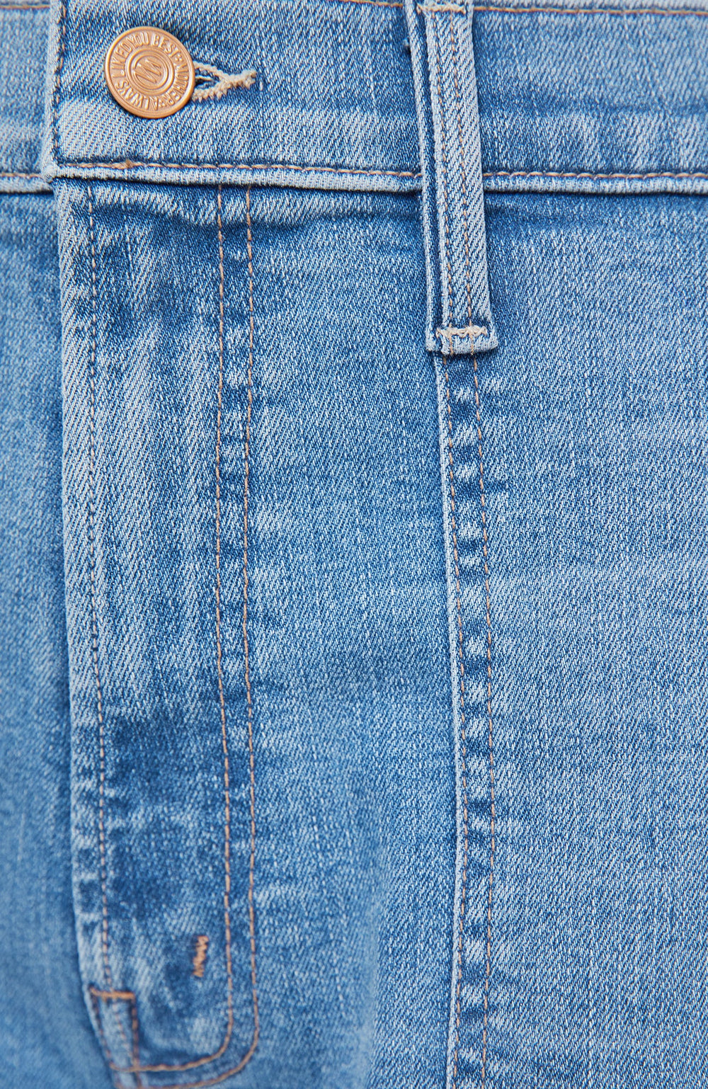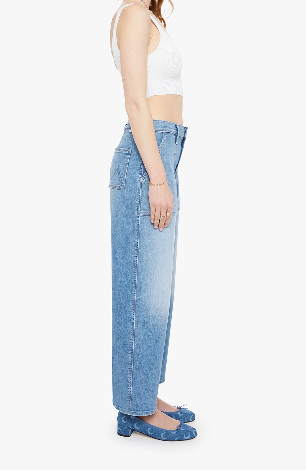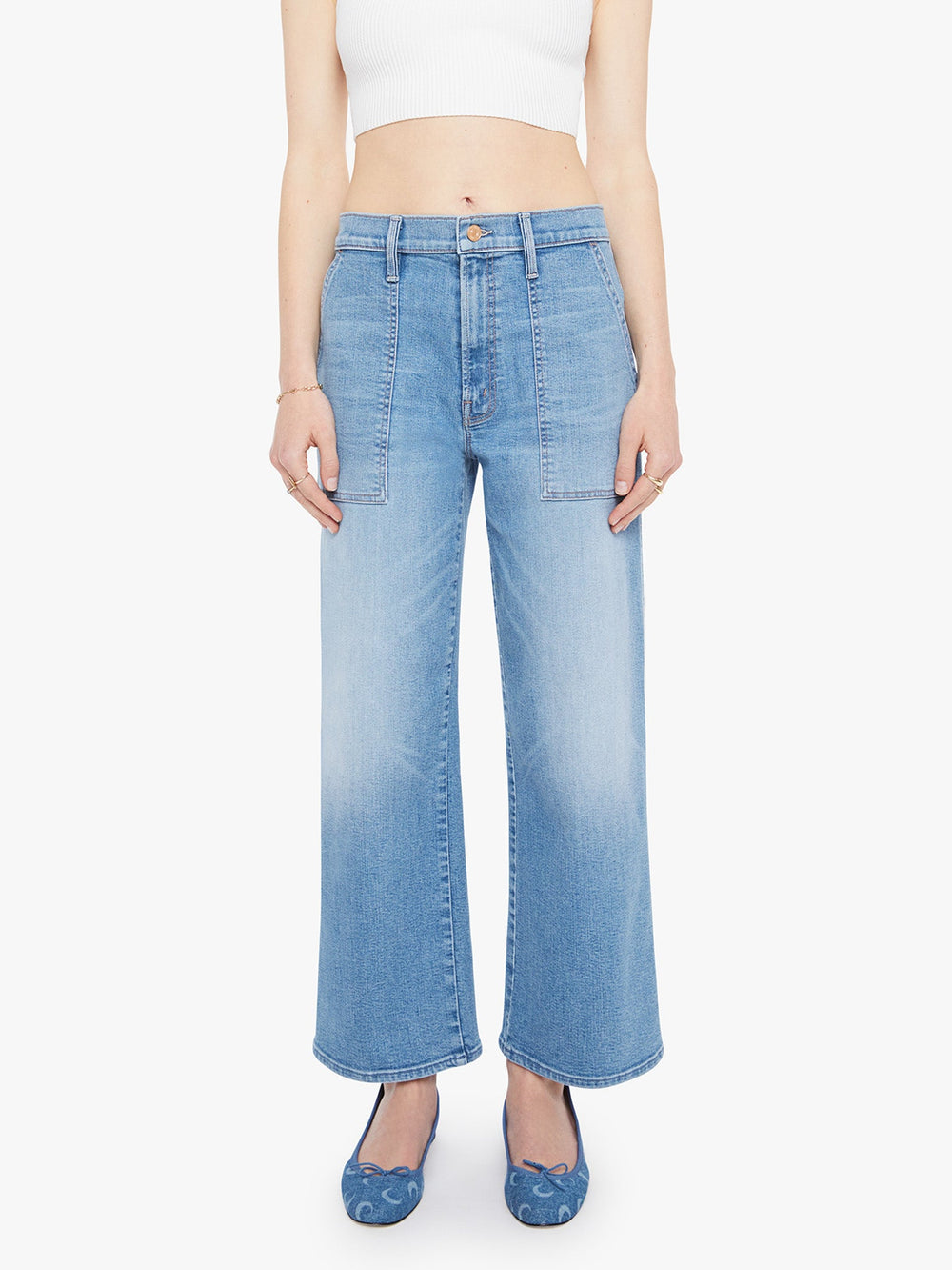 Full throttle. Super high-waisted jeans with a loose fit, wide leg, zip fly, patch pockets and a 28.25-inch inseam with a clean hem. Made from a blend of recycled stretch denim, Ride Hard Live Louder is a light blue with subtle whiskering and fading at the knees.