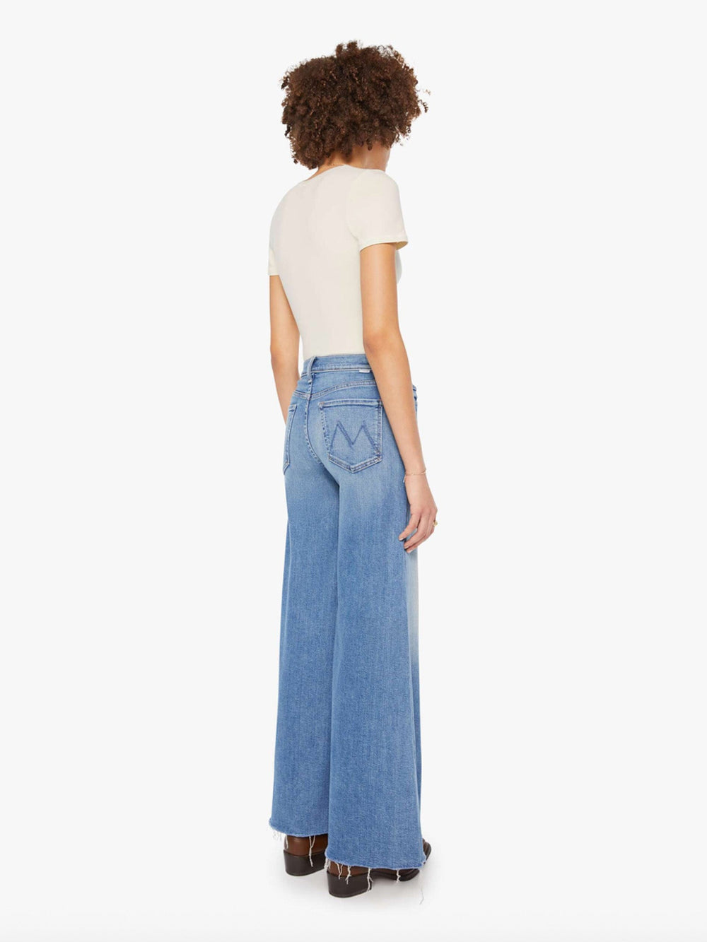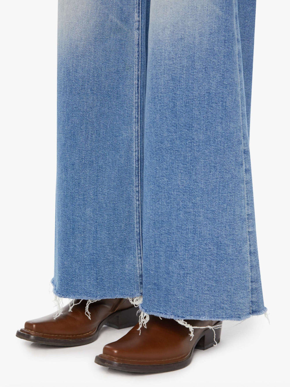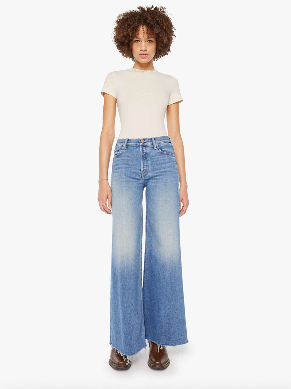 On a roll. High-waisted wide-leg jeans with a button fly, long 32-inch inseam and a frayed hem. Cut from stretch denim, Poppin' Wheelies is a mid-blue with whiskering and fading at the knees.