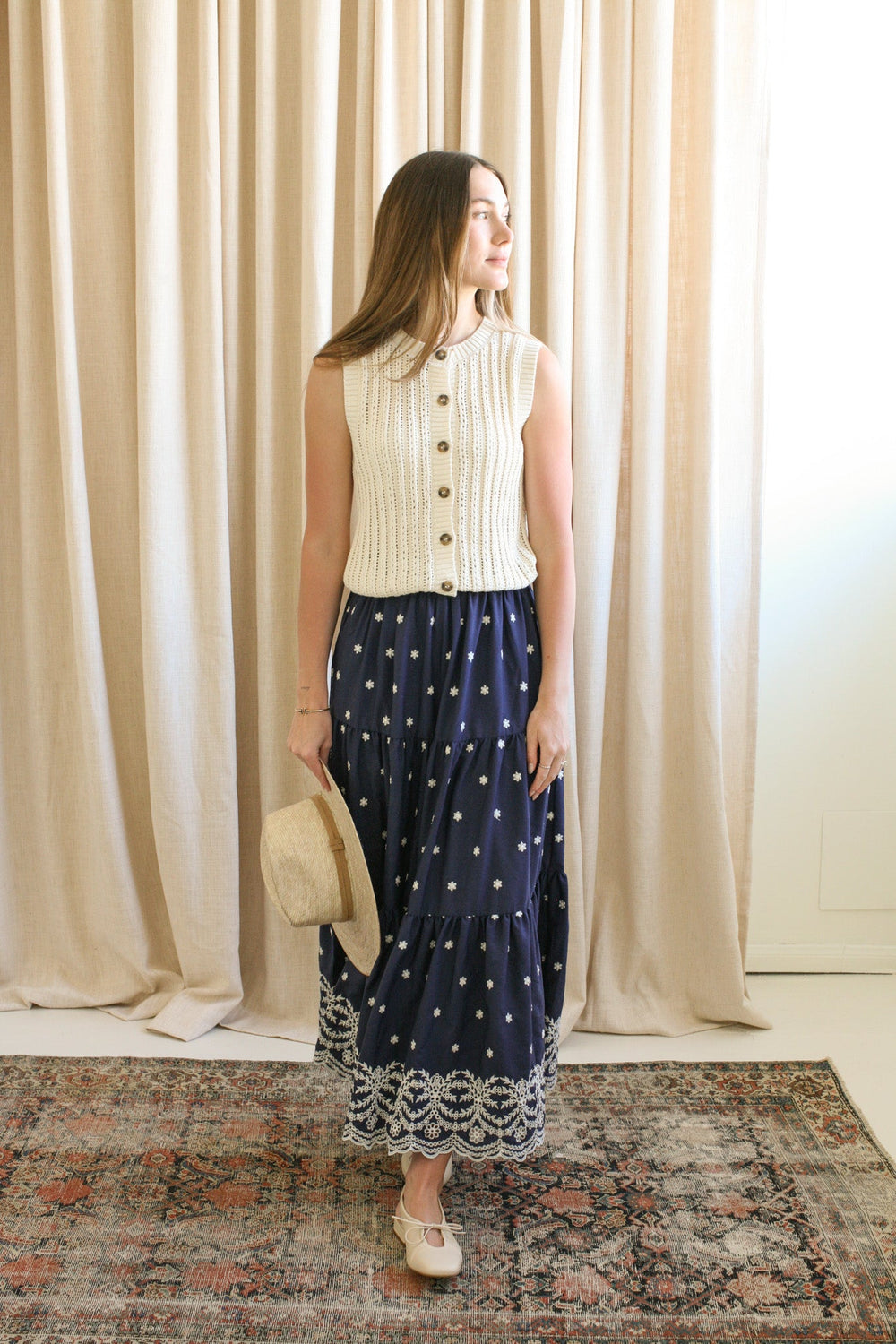 This woven tiered midi skirt features embroidering and elasticized back waistband for additional comfort. Pair with a blouse and ballet flats this spring.