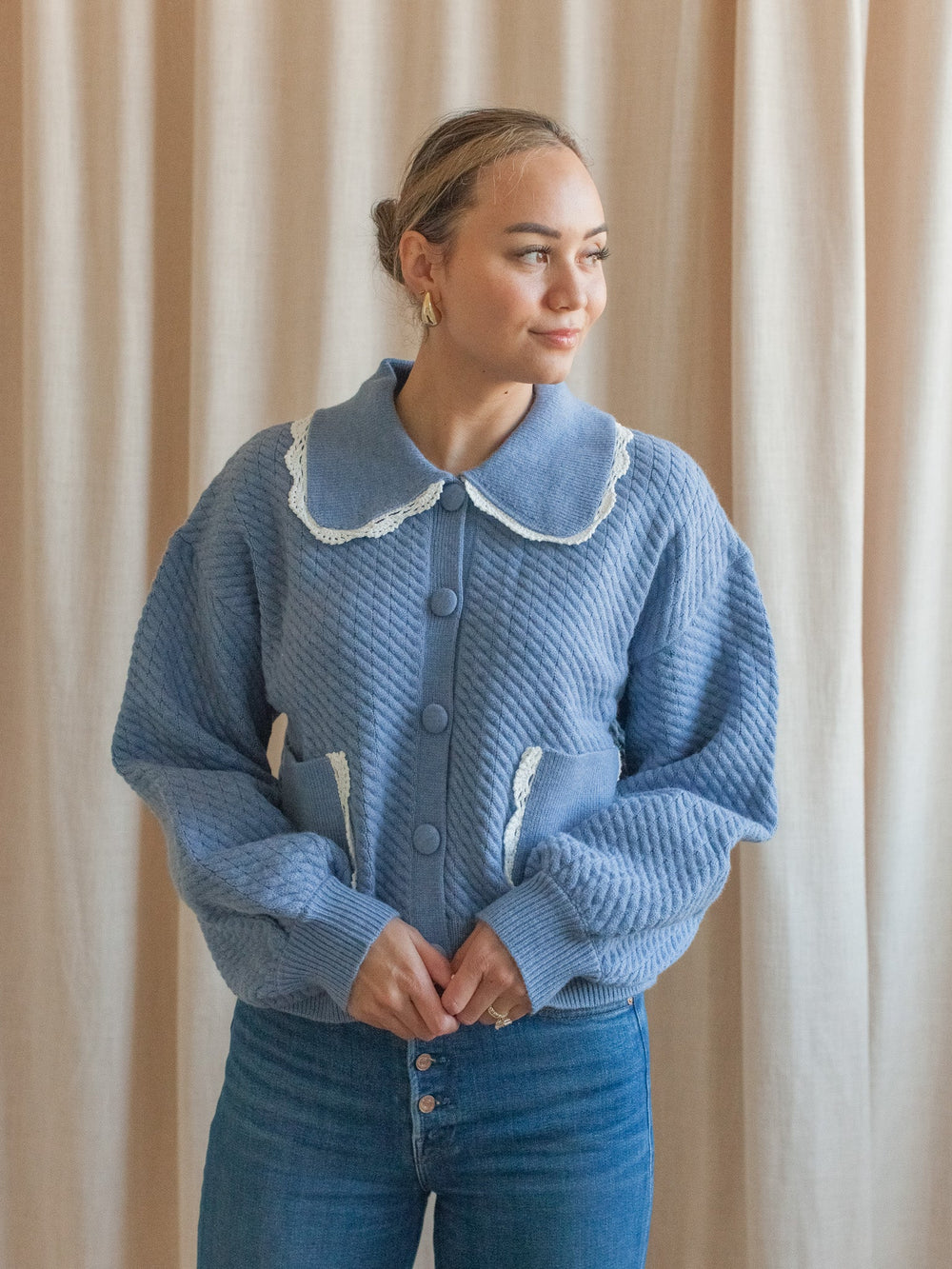 A button front cable knit cardigan with balloon sleeves and a slightly oversized fit. Features a statement collar and front patch pockets complete with contrasting crochet trim.