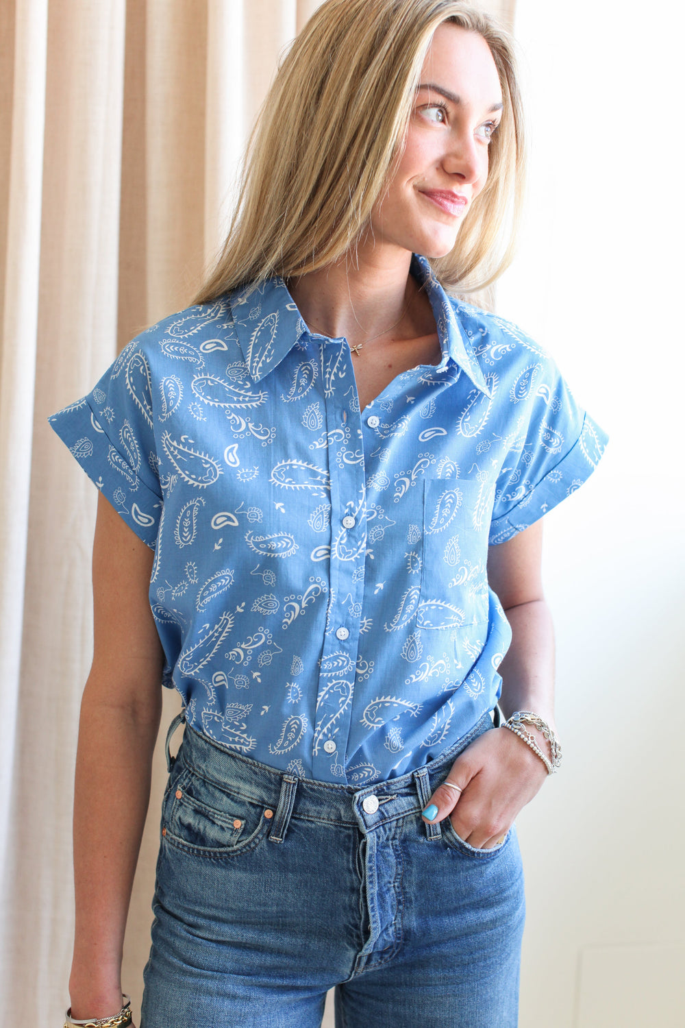 This short sleeved blouse is lightweight, boxy and great to pair with jeans or a skirt for summer. It features a button up front with short slits on the sides, collared sleeves and a front pocket.