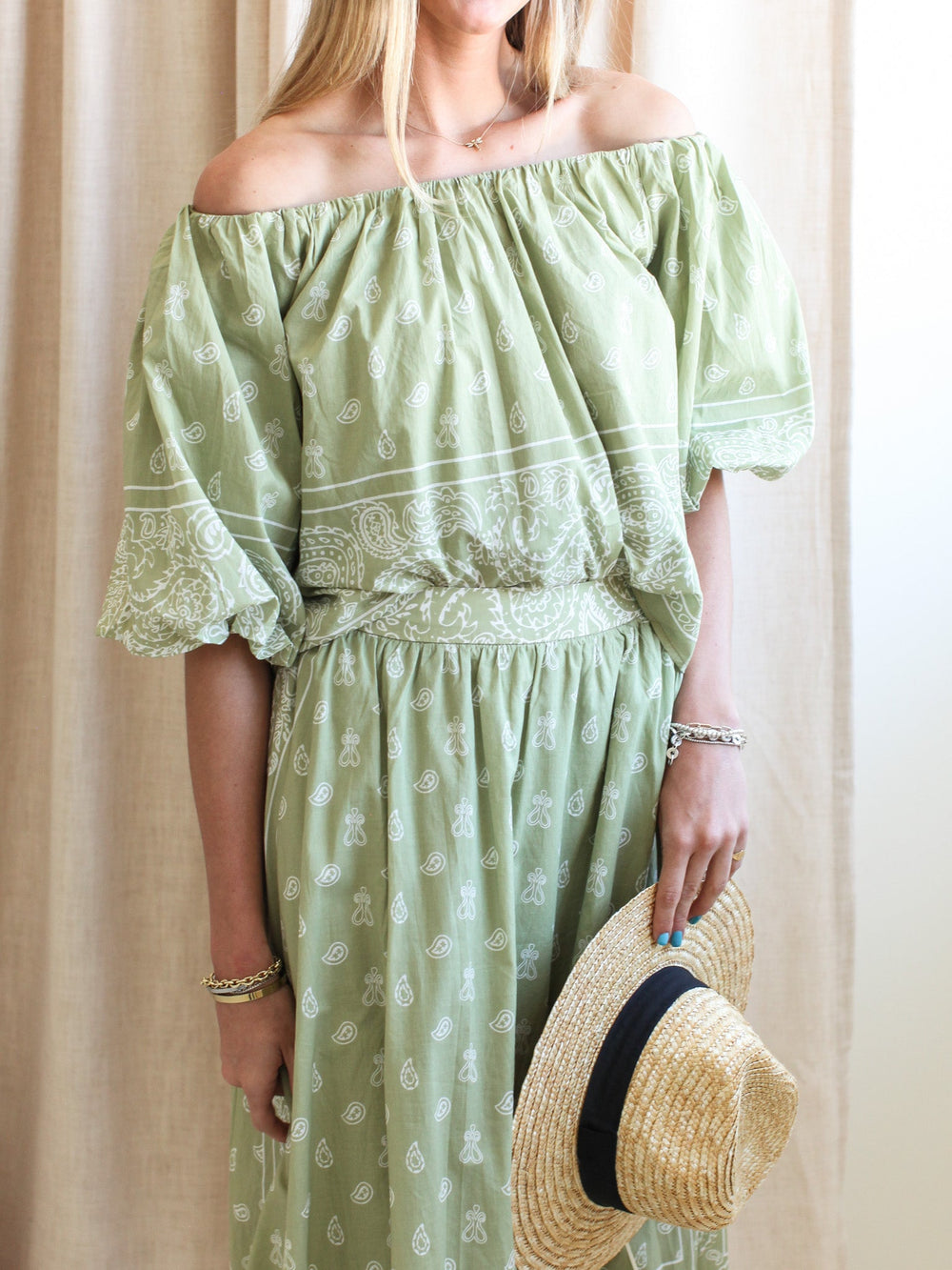 This 100% cotton paisley top is perfect for warmer days ahead. Featuring off shoulder neckline and short puff sleeves. Pairs perfectly with the matching Paisley Midi Skirt or your favorite pair of denim.