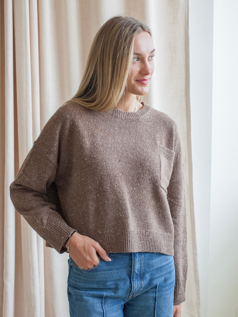 A classic drop-shoulder marled crewneck sweater with a slightly boxy silhouette and chest pocket, features ribbed cuffs and neckline. Pair with jeans or trousers.
