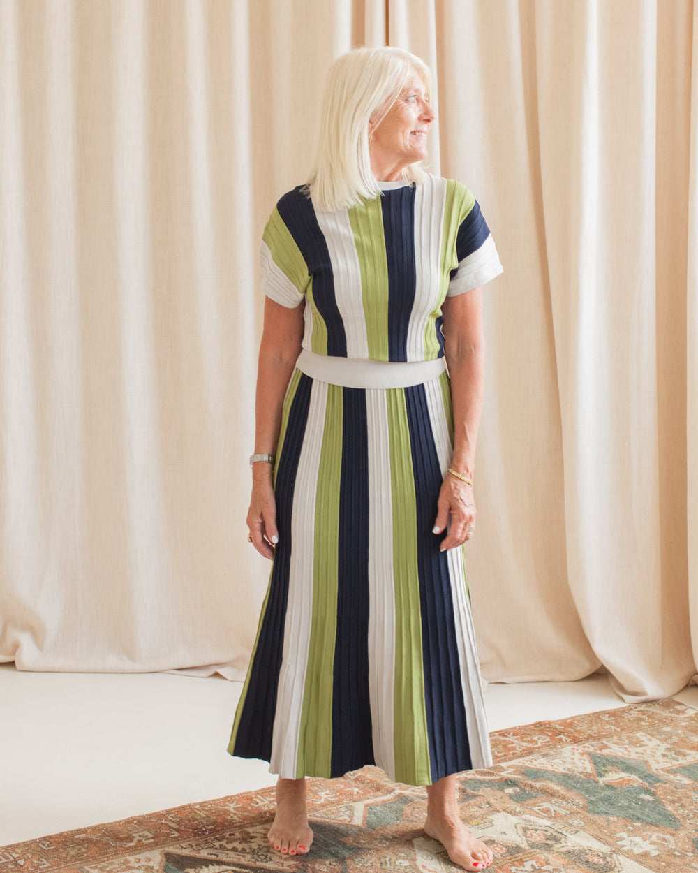 A midi skirt with ribbed detailing featuring an elasticated waistband for additional comfort. Pair with the Ruby Knit Sweater and heels for an elevated look this fall.