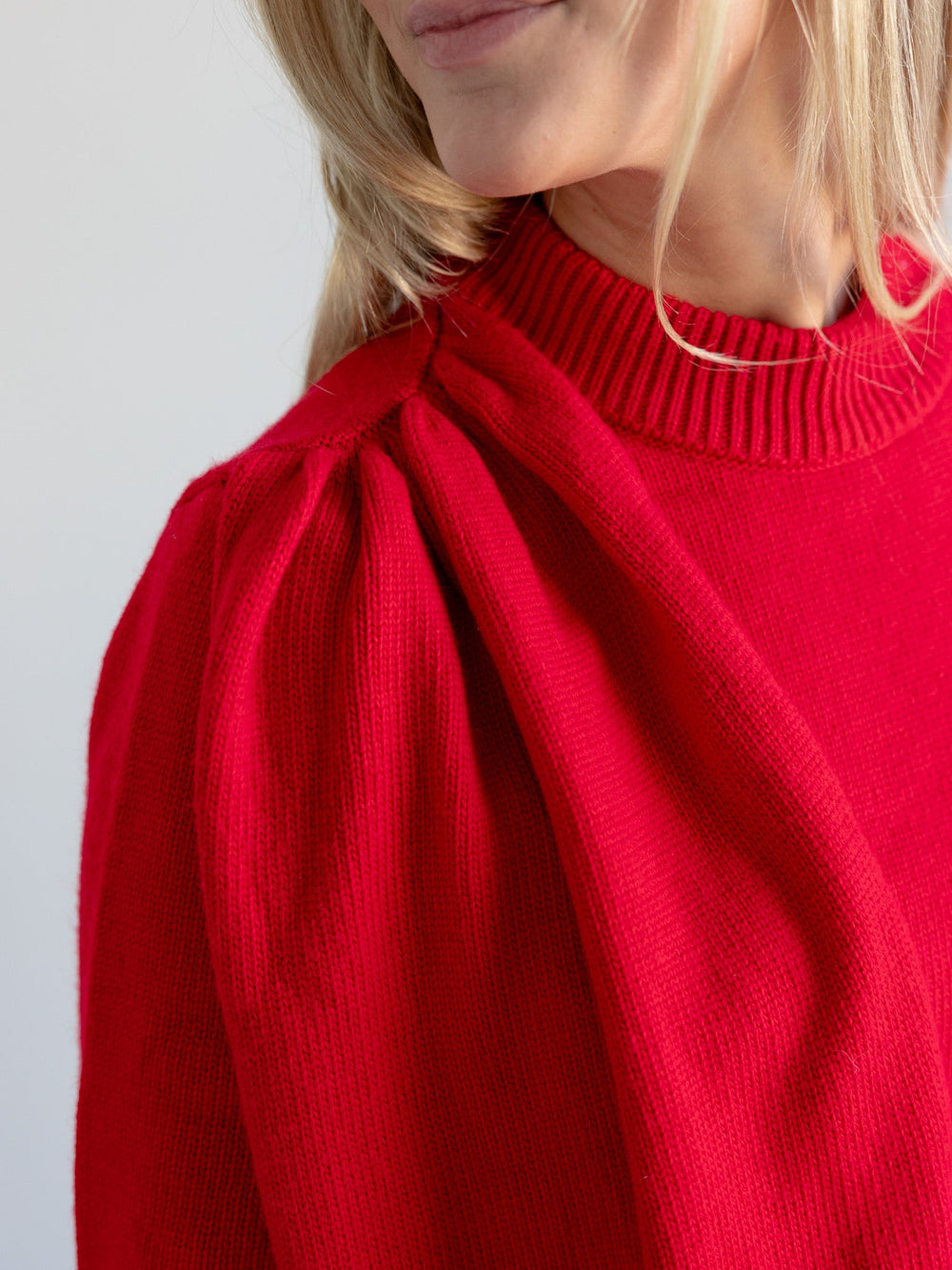 The Ruby Scarf Sweater is ready to keep you warm on those cold days ahead. Featuring a full length bodice, contrast chunkier knit at collar and hem, and a pleated scarf at shoulder to wrap around your neck. Pair with denim and booties.
