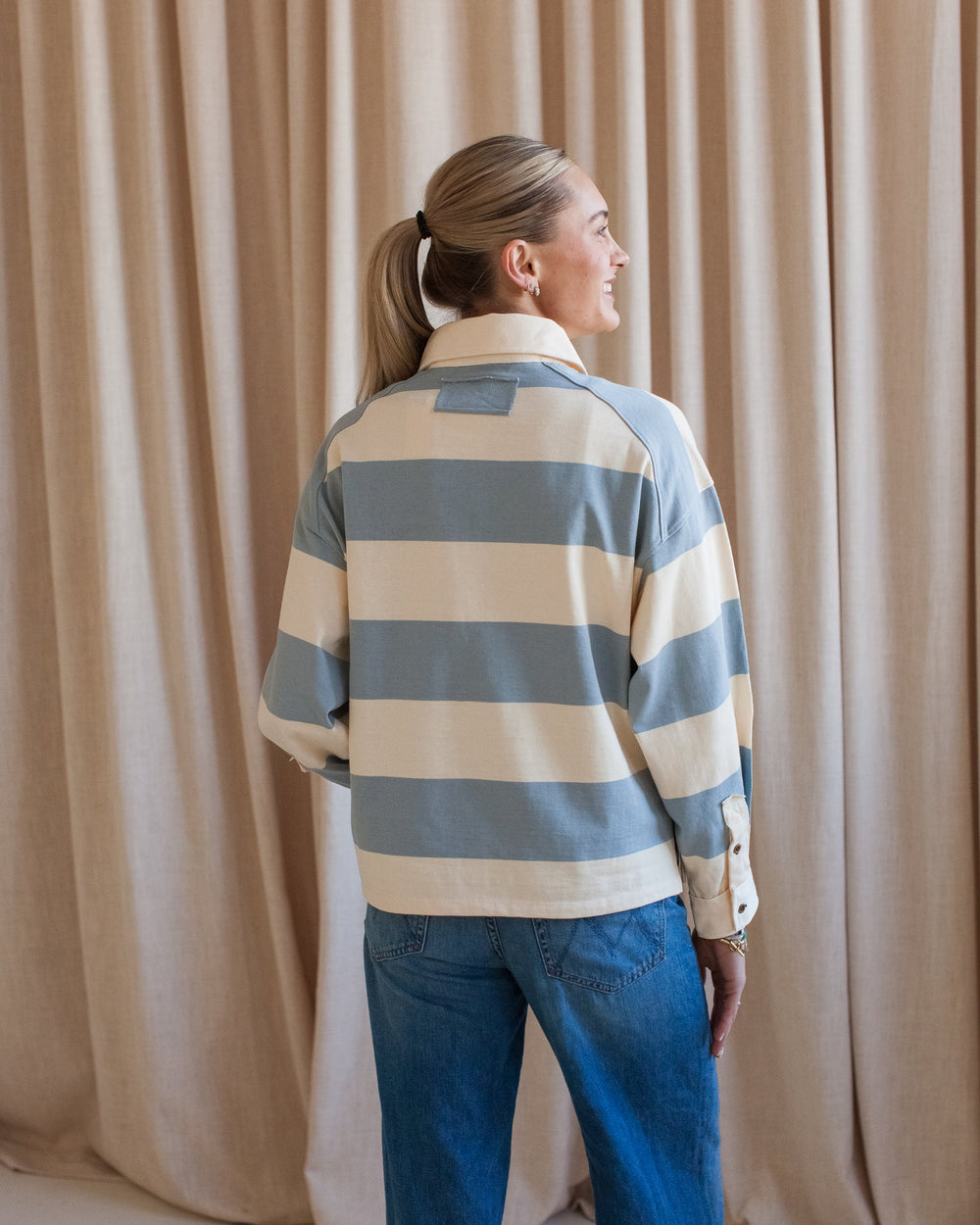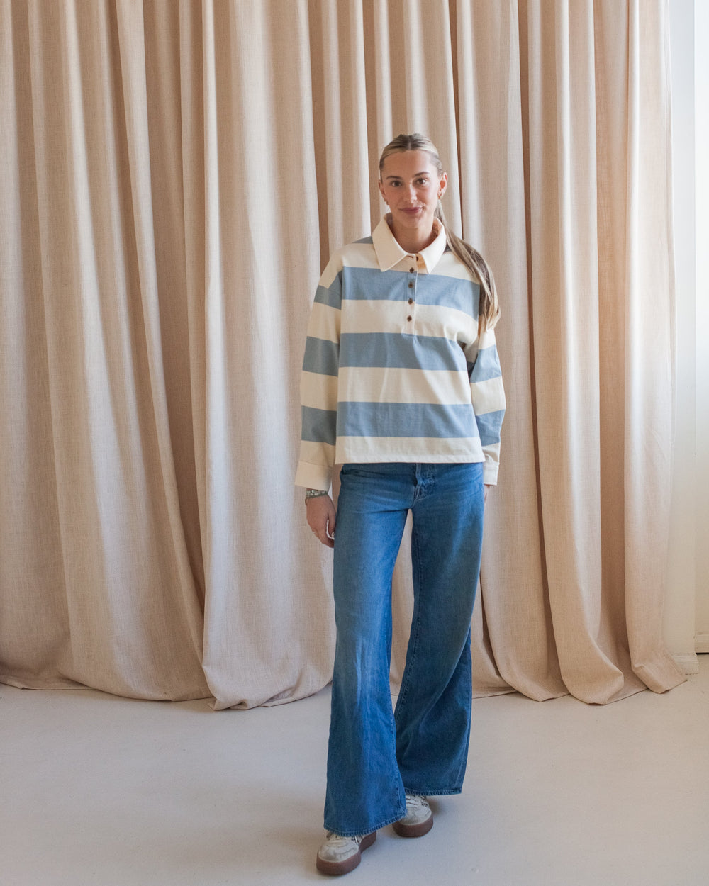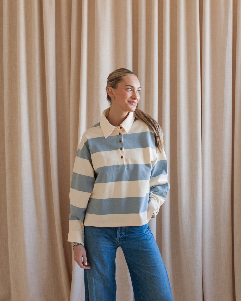This 100% cotton long sleeve polo features a relaxed fit, timeless blue and cream stripes, and a button down collar. It's the perfect easy layer for any season.