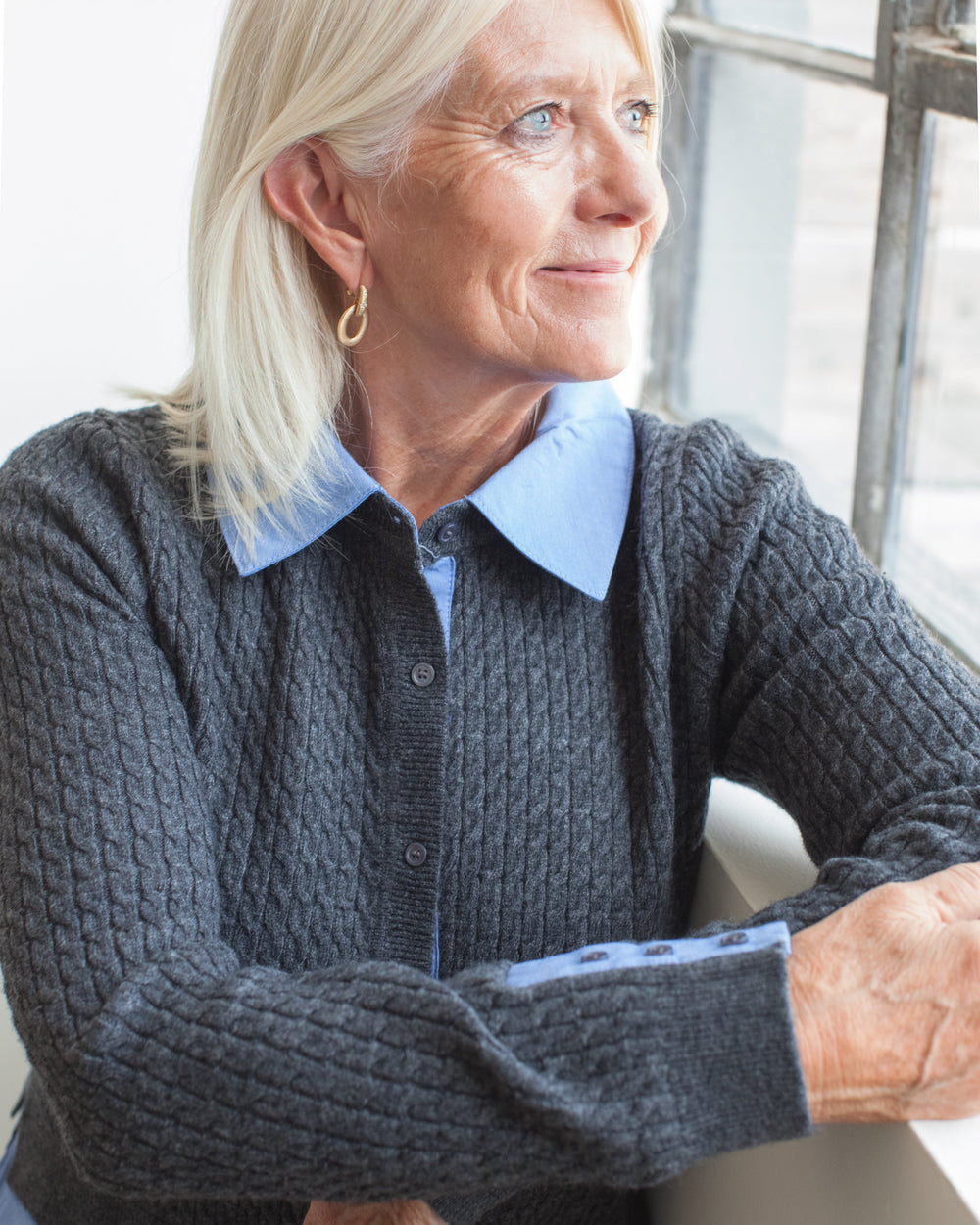 This cable knit cardigan gives the illusion of a layered button up shirt without the bulk. Features a shirt collar, button front, and buttoned cuffs. Pair with jeans and ballet flats for an effortlessly put together look.