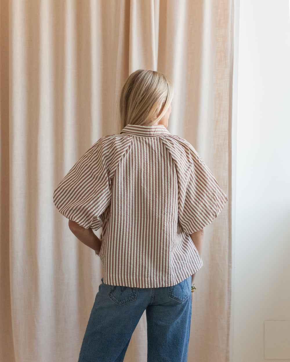 A short sleeve striped button front blouse with voluminous puff sleeves, front pocket, and collar. Wear tucked into your favorite denim with flats or brown ankle boots.