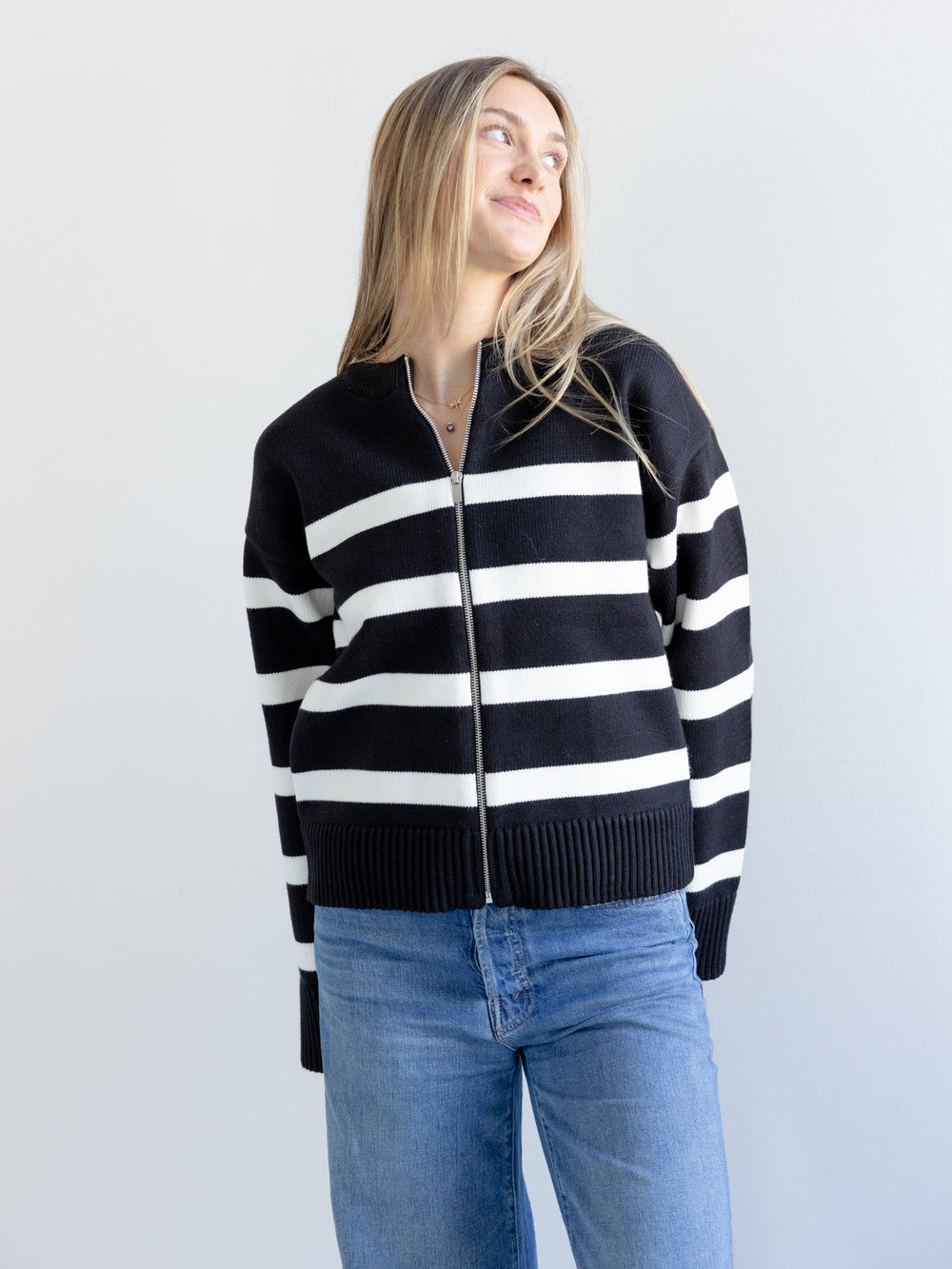 Embrace the chilly weather in style with our Stripe Zip Sweater. This cozy sweater jacket features a front zipper for easy wear and a round neckline for a flattering look. Crafted with a classic striped design it adds a touch of sophistication to any outfit. Made with high-quality fabric this sweater is perfect for staying warm while looking fashionable.