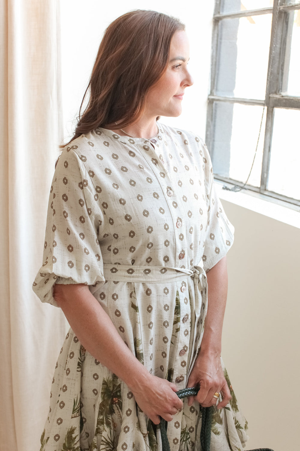The perfect mini dress for those warmer summer days. Featuring buttons along the front, elasticized sleeves, and adjustable tie. Pair with your favorite summer sandal or heels for a night out.