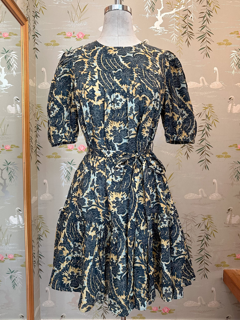 Crafted from a cotton blend with tonal stripes, our Rosalie Dress captures the eye with graphic botanicals inspired by a vintage indigo panel. This multicolored printed dress has gently puffed short sleeves and a voluminous silhouette that can be tempered with the removable tie belt. It has a gathered hemline for graceful movement, side pockets, and fastens with a center-back tie and button closure.